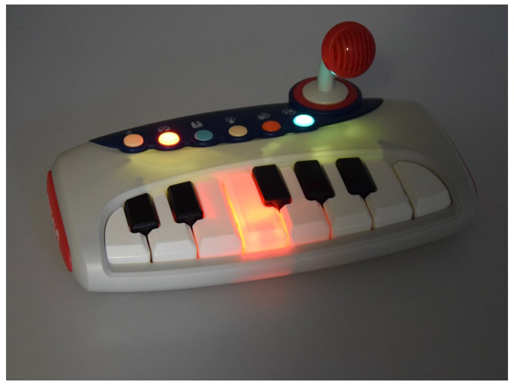 Ez a színes interaktív zongora tökéletes minden kis zenerajongó számára. A zongorán hat különböző világító pasztell gomb és fekete-fehér billentyű található. A zongora a játék hátulján található kapcsolóval indítható. A csomag 3 db 1,5 V-os AA elemet tartalmaz.