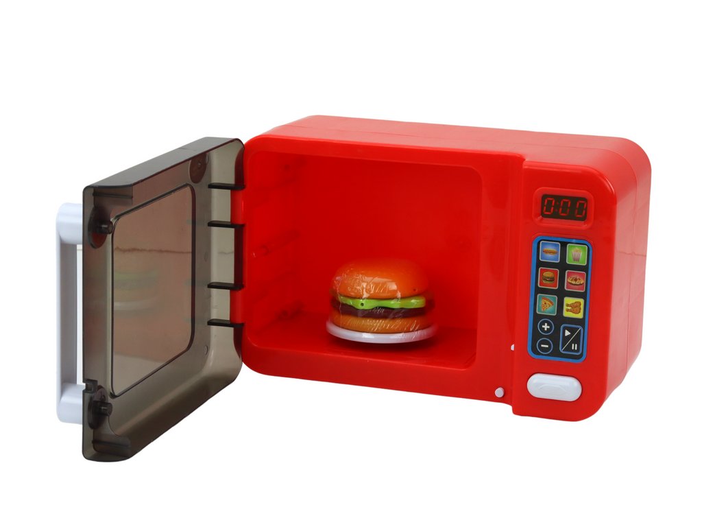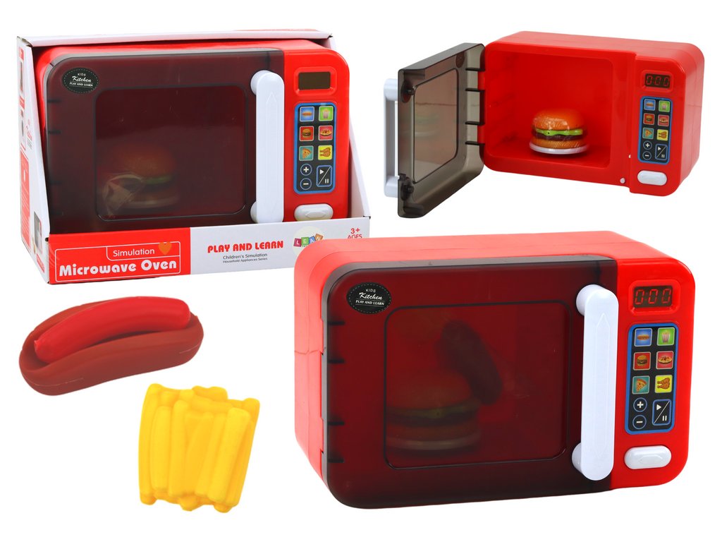 Mikrohullámú sütőnk nem csak játék – ez egy interaktív élmény, amely életre kelti az otthoni játékot. A gomb megnyomása után a sütő varázslatos főzési szimulációba kezd. A háttérvilágítású belső tér úgy néz ki, mint egy igazi mikrohullámú sütő, a mozgatható tányér pedig valósághűbbé teszi. A gyermek akár kinyithatja az ajtót, hogy berakja a melegítendő ételt, és az idő lejárta után kiveheti a kész ételt. A készletben ételjátékokat is találsz - hamburgert, sült krumplit és hot dogot, amelyek még tovább gazdagítják a szórakozást.