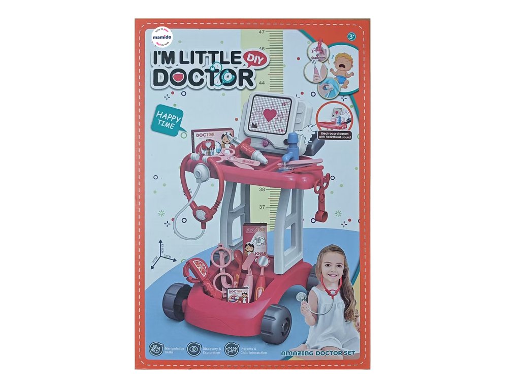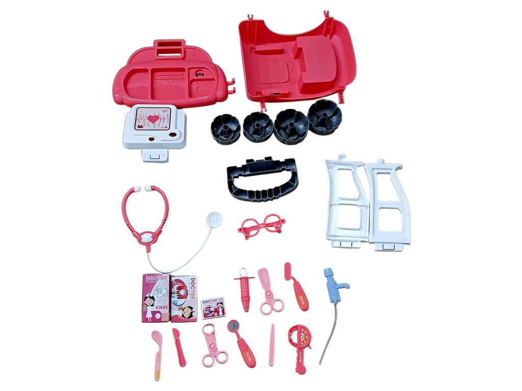 Ez a tolókocsis orvosi készlet valósághű elemeket tartalmaz, mint például EKG-monitor szívveréssel, sztetoszkóp, injekció, szemüveg vagy hőmérő. A tolókocsi kerekekkel van felszerelve, így a kis orvos könnyen közlekedhet egyik betegektől a másikig. Remek játék, amely támogatja a gyermekek fantáziáját, empátiáját és szociális készségeit a szerepjáték során.