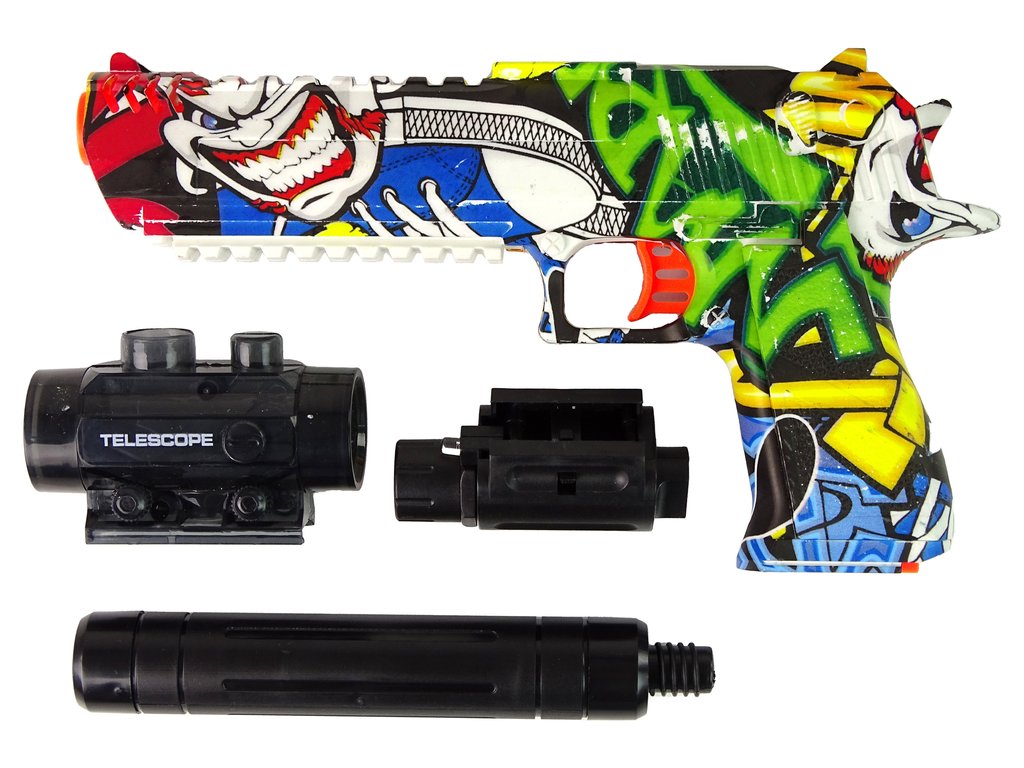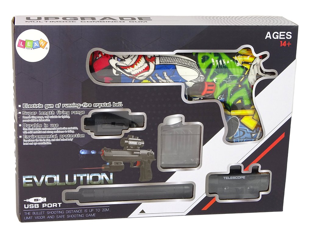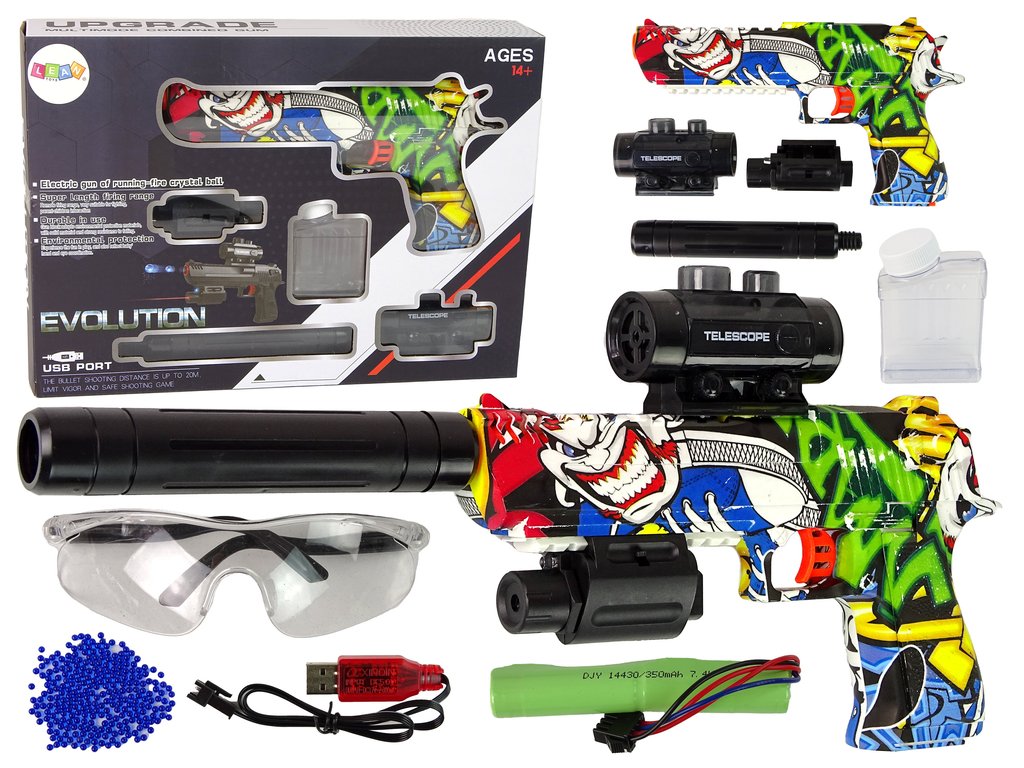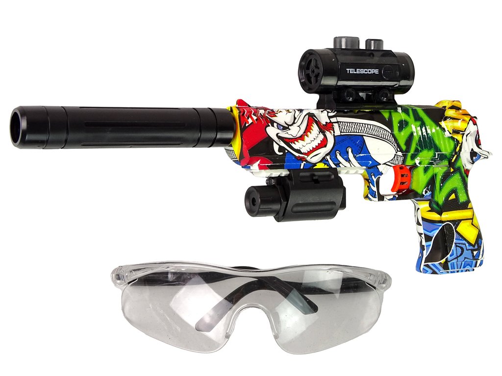 Zbraně jsou hračky, které chce mít ve své sbírce každý malý kluk. Přesně taková je elektrická pistole s laserem na gelové náboje. Zaměřovač, který umožňuje přesnější míření je umístěný na horní části. Zadní část je odnímatelná, čímž vznikne kompletní nový model. Vodní gelové kuličky jsou vyrobeny z netoxických materiálů a před hrou je stačí namočit na 3 hodiny do vody.