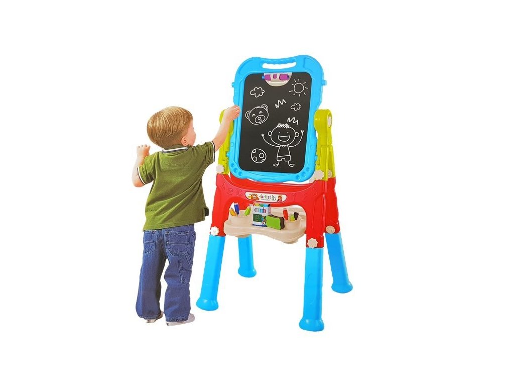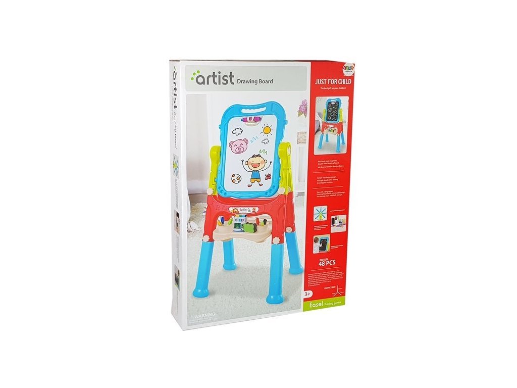A gyerektáblának két rajzfelülete van - egy fehér, amely letörölhető jelölőkkel, egy fekete pedig krétával rajzolható. 360 fokban elforgatható. A készlet fekete, kék, piros, zöld és sárga markereket, valamint egy 12 darab krétát tartalmaz. Mivel a játéktábla mágneses, színes mágneseket tartalmaz, amelyek segítségével képeket rögzíthet a táblára. A teljes készlet 48 elemet tartalmaz.
