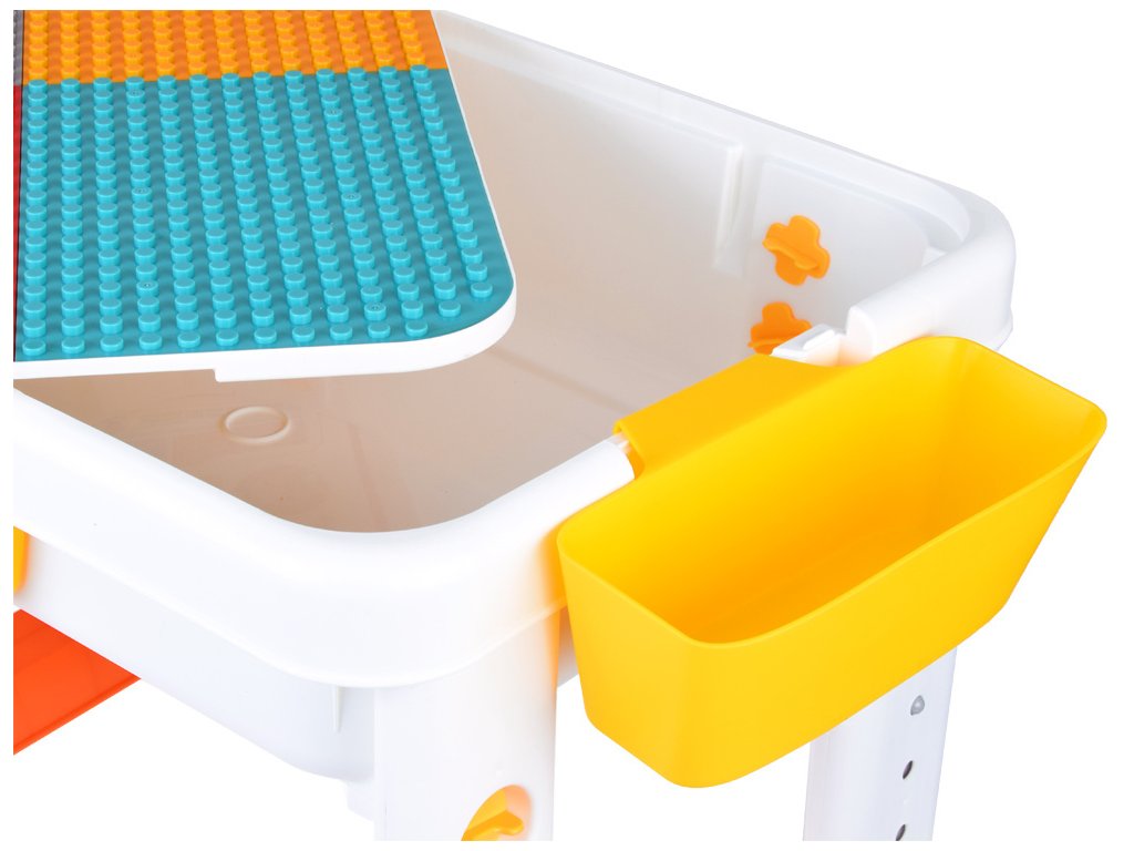 - Kockaépítő asztal – a színes kétoldalas tábla lehetővé teszi az oldalak egyszerű váltását. Az egyik oldal a blokkok összekapcsolására szolgál (a csomag tartalmazza - 55 darab), amely a játékokat szépen együtt tartja, és nem szóródik szét a helyiségben.