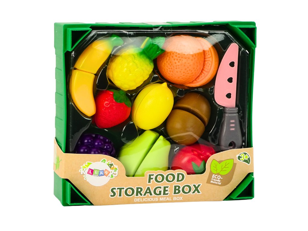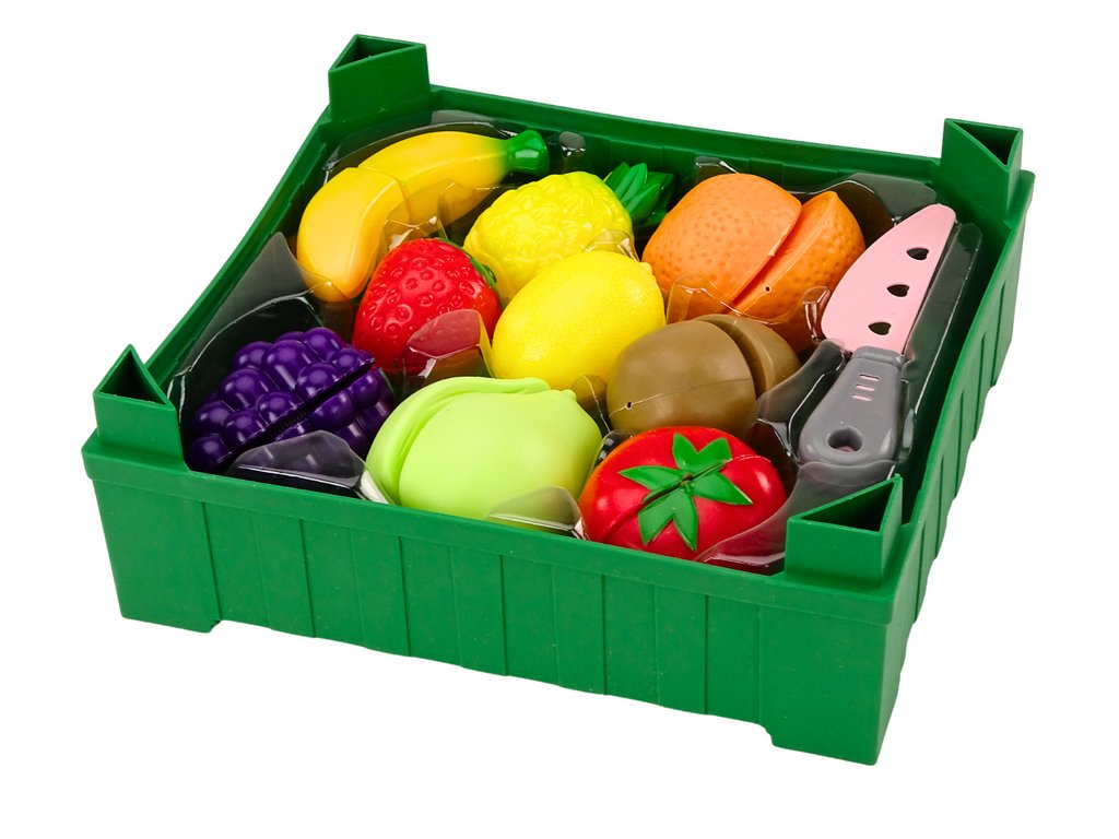 A dobozos gyümölcsvágó készlet nagyszerű választás azoknak a gyerekeknek, akik szeretik a felnőttek napi tevékenységét utánzó játékokat. A készlet kilenc valósághűen megalkotott gyümölcsöt tartalmaz, melyek tépőzárral vannak összekötve, így a gyermek valódi szeletelést utánozhat.