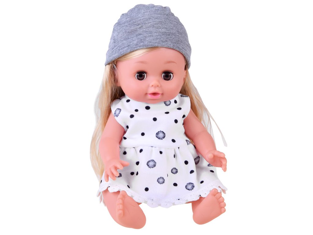 V setu je krásná panenka s hnědýma očima a dlouhými, blond vlasy. Je oblečena v roztomilé bílé šatečky s puntíky. Celkový vzhled doplňuje šedá tenká čepice, ideální na procházky. Oči panenky se zavírají, takže může i spát. Tělo hračky je vyrobeno z plastu, zatímco hlava, ruce a nohy jsou z gumy.
