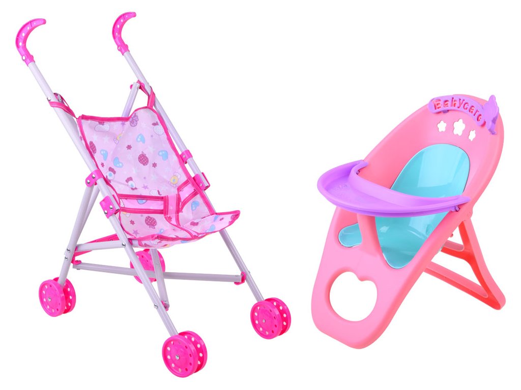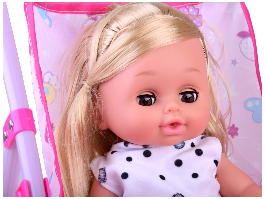 Po spánku je čas na procházku v oblíbeném kočárku. Rám a kola kočárku jsou vyrobeny z plastu. Pozornost upoutává roztomilý, světle růžový materiál s grafikou srdíček, ovoce a květin. Kočárek je vybaven pásy, které chrání panenku před vypadnutím. Snadno se skládá na typ „deštníkový“, takže nezabírá mnoho místa v pokoji.