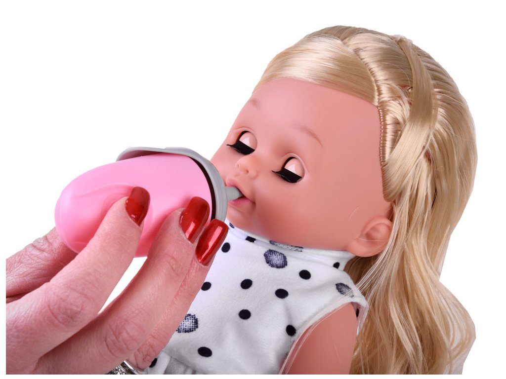 Panenku můžete krmit přiloženou lahví. Disponuje také funkcí močení. V setu je rovněž plenka a nočník, na který můžete panenku posadit po jídle.