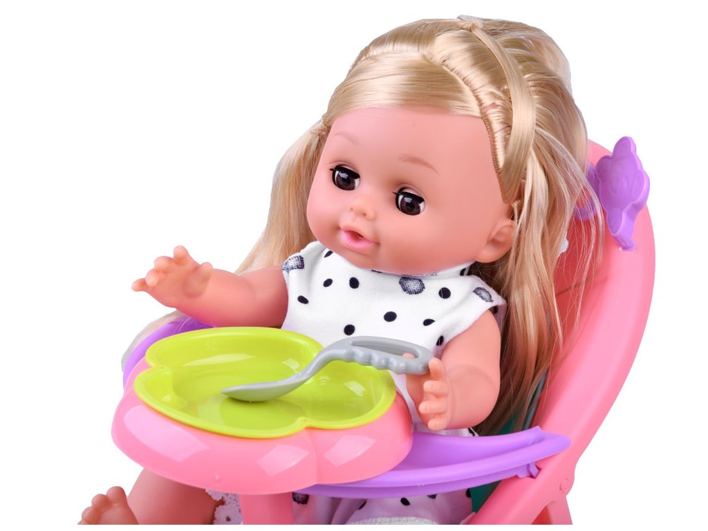 Na jídla můžeme panenku bezpečně usadit v jídelní židličce. Židlička je vybavena stolečkem, na který můžete během krmení položit misku. V setu je také sada bezpečných příborů (lžíce, vidlička, nůž).