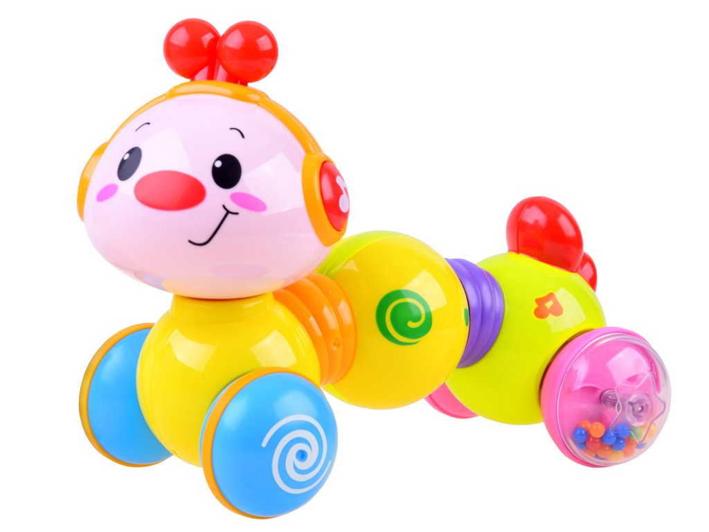 Interaktivní hračka s hudebním efektem poskytne vašemu dítěti mnoho radostných chvil zábavy. Stačí stisknout hřbet hračky a ta se rozjede a pohybuje se po rovné ploše. Zvuk se spouští stisknutím sluchátka s notičkou, přičemž melodie jsou klidné a příjemné pro uši. Hlava housenky je pohyblivá a během hraní hudby svítí a mění barvy, lze ji také otáčet doprava a doleva.