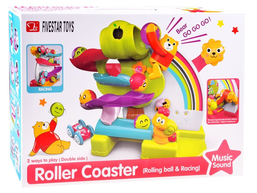 Dráha se skládá ze čtyř úrovní. Obě kuličky umístíme na spodní dráhu, aby se zastavily u šneka. Po zatáhnutí za páčku s hlavičkou lvíčka, medvídek udělá salto a chytí kuličku. Pusťte páčku a medvídek znovu provede obrátku a hodí kuličku na nejvyšší dráhu. Kulička se kutálí po jednotlivých prvcích dráhy, čemuž doprovází veselá hudba, jejíž hlasitost lze regulovat. Je také možné si hrát bez hudby (přepínač se nachází v bílém panelu). Hračka je napájena bateriemi 2 x AA (nejsou součástí balení).