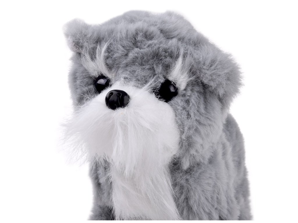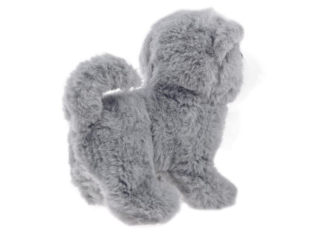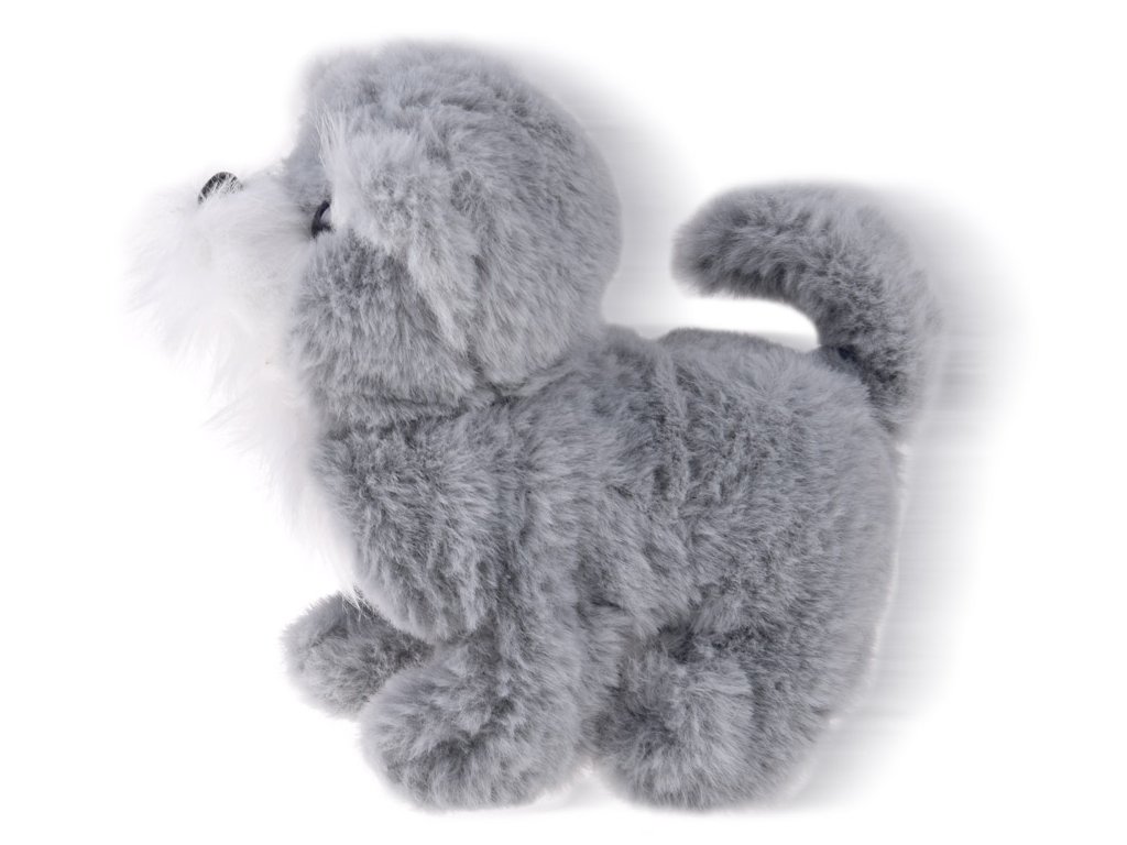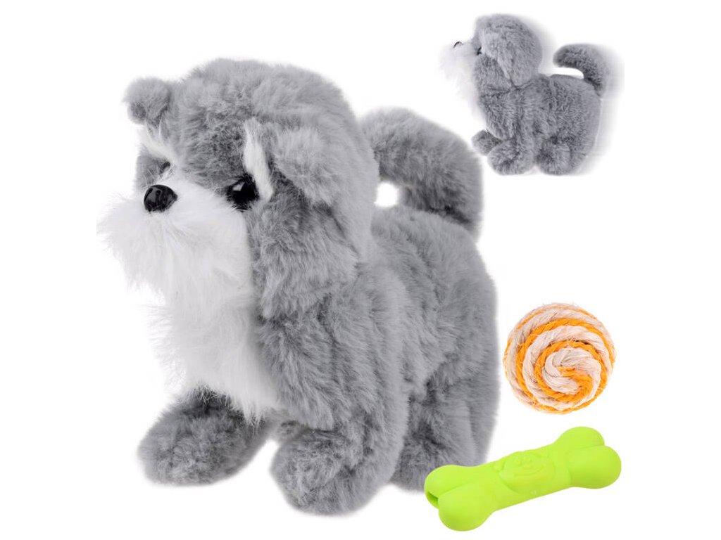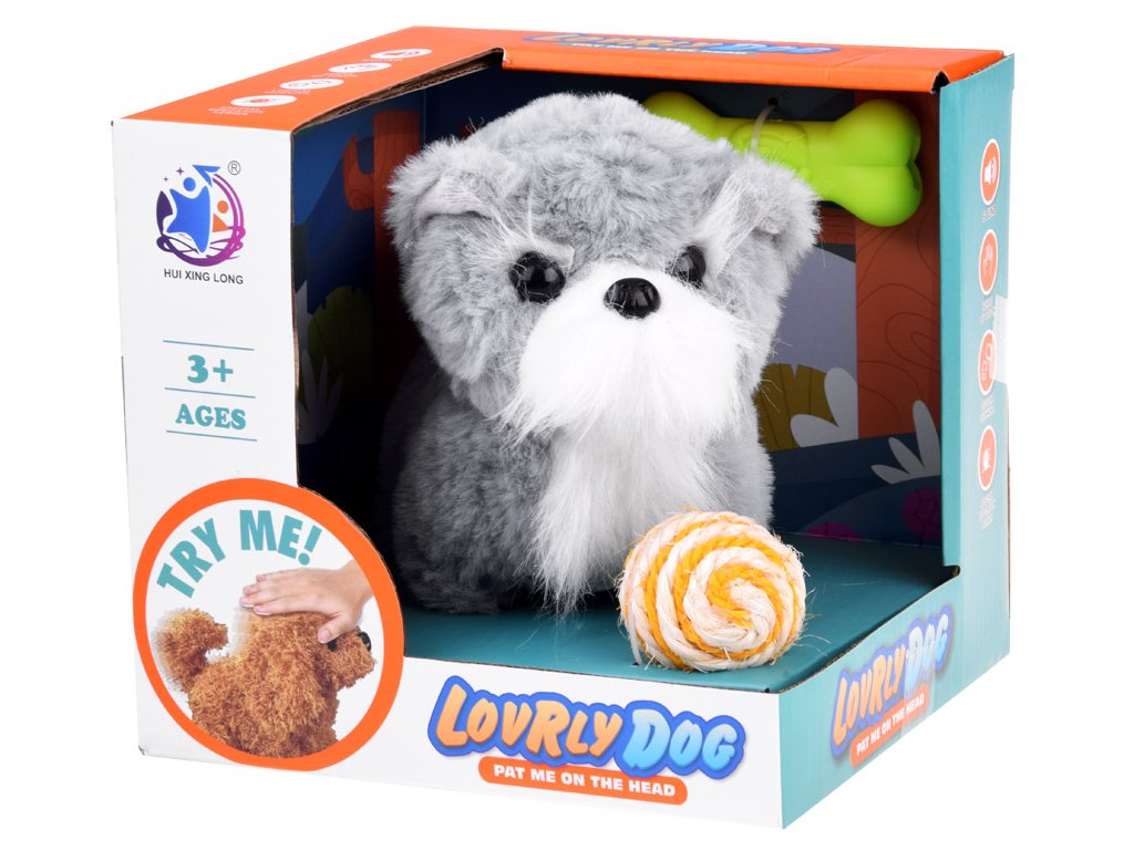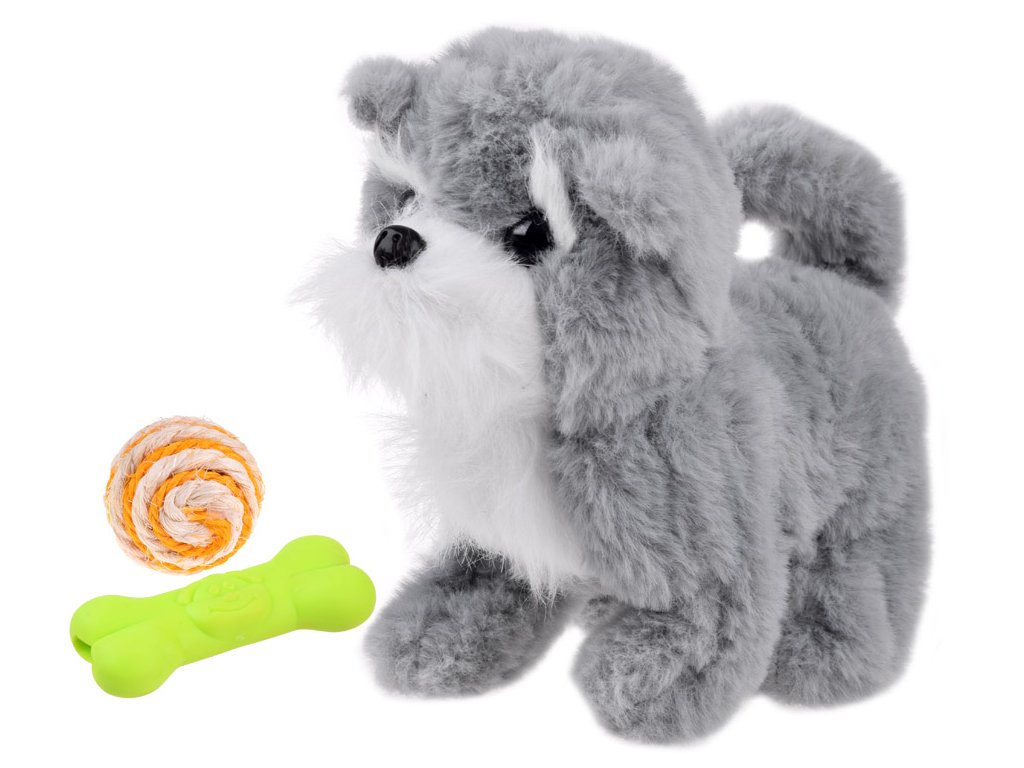 Interaktivní plyšový pejsek ohromí každé dítě a stane se jeho nejlepším společníkem. Pejsek má příjemný šedý kožíšek k doteku, černé lesklé oči a čenich z plastu. Tato hračka funguje na baterie a po jejich nainstalování začne pohybovat hlavou, čumáčkem a ocasem, štěkat a pískat, chodit vpřed a couvat. Kromě toho, pejsek má k dispozici měkkou gumovou zelenou kostičku a pestrobarevný míč obalený provázkem.