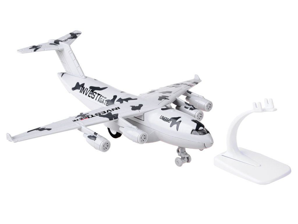 A csomag tartalmaz egy állványt, amely biztosítja, hogy a szállítórepülőgép remekül mutasson a polcon egy gyűjtemény részeként vagy kezdeteként.