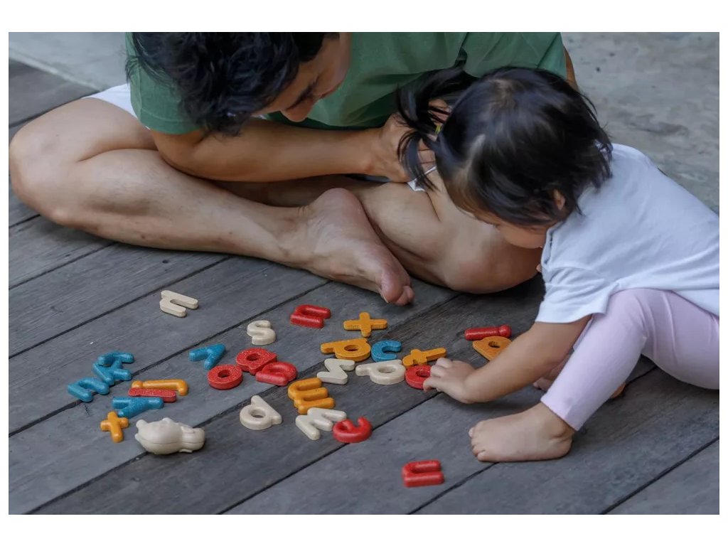 A betűk fából készültek és színkóddal vannak ellátva: a piros szín a magánhangzókat, a sárga a mássalhangzókat jelöli, ami megkönnyíti a felismerésüket. A készlet tartalmaz egy nyomtatható játékkártyát is az egyes betűk megtekintéséhez.