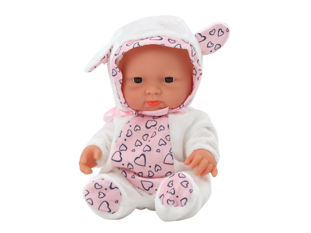 Aranyos kis baba baba! 21 cm x 14 cm méretű, ez az apró baba tökéletes társ minden kislány számára. Gyönyörű fehér ruhába öltözött, szívecskékkel díszítve, amelyek tovább fokozzák varázsát és édes megjelenését.