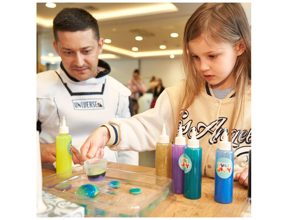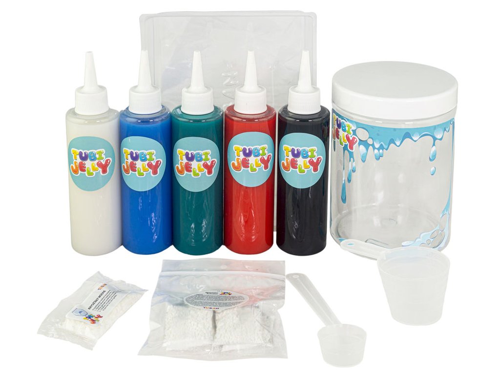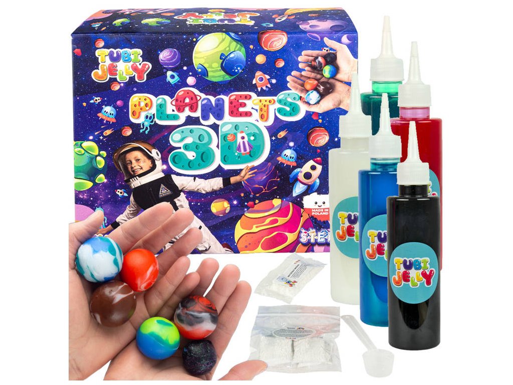 Tubi Jelly – PLANETY je zábavný set, který umožňuje samostatně vytvořit gelové planety sluneční soustavy a barevné pružné koule v různých velikostech. Set obsahuje gelové kapaliny, aktivátor a veškeré příslušenství nezbytné k provedení domácího experimentu, během něhož se gel mění na hotovou planetu. Hraní se setem je skvělým způsobem, jak objevovat tajemství vesmíru, experimentovat s barvami a poznávat chemické zajímavosti. Ke setu je přiloženo speciální akvárium, ve kterém lze z vlastnoručně vytvořených planet udělat celé galaxie. Set se skvěle hodí jako dárek pro milovníky domácích experimentů, budoucí vědce a všechny, kteří si rádi vyrábějí hračky sami.