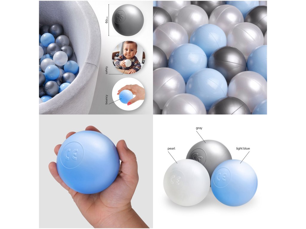 Labdák száraz medencébe Ø 6 cm 200 db (gyöngyház, ezüst, gyöngyház világoskék)