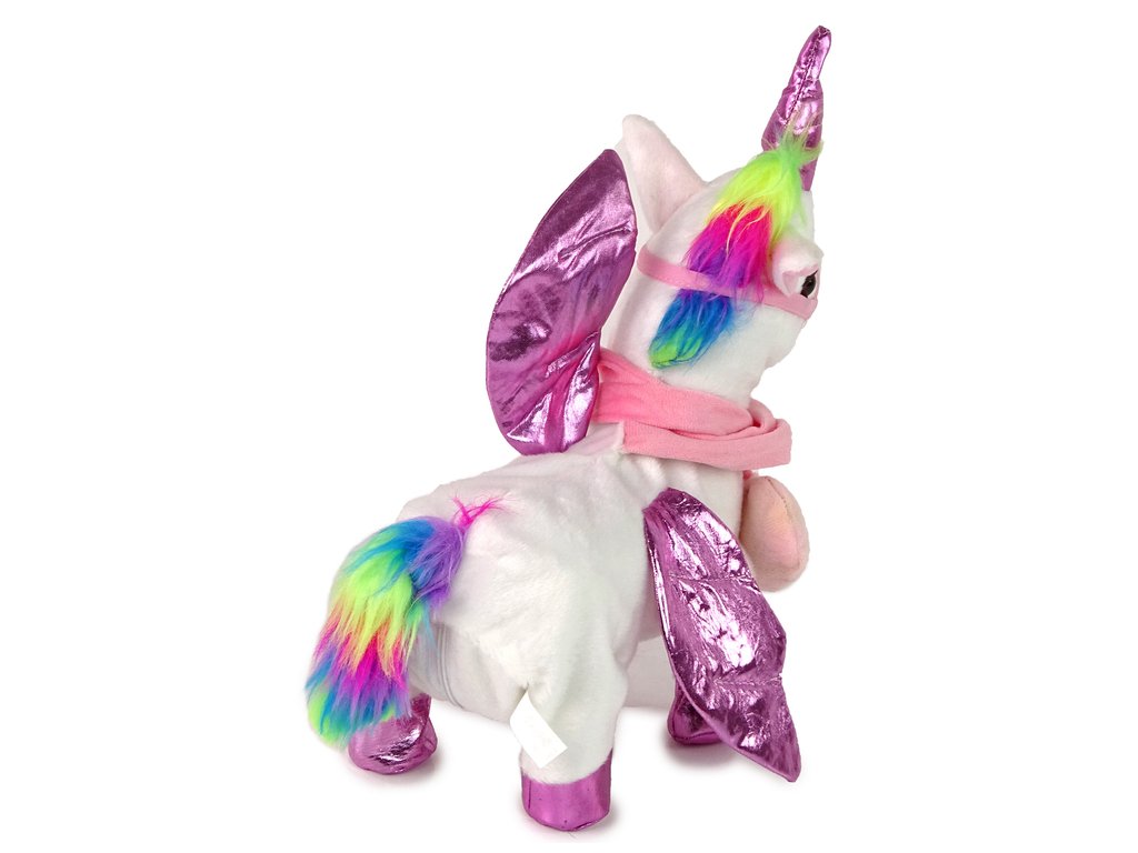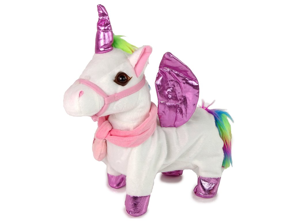 Az interaktív egyszarvú a legnagyobb odafigyeléssel készült, fehér színű, puha tapintású és rózsaszín szárnya van. Az egyszarvú dorombol és egy country dallamot játszik. Az elemek behelyezése után csak nyomja meg a póráz fogantyúját, és az egyszarvú sétál, mozgatja a farkát és a fejét.