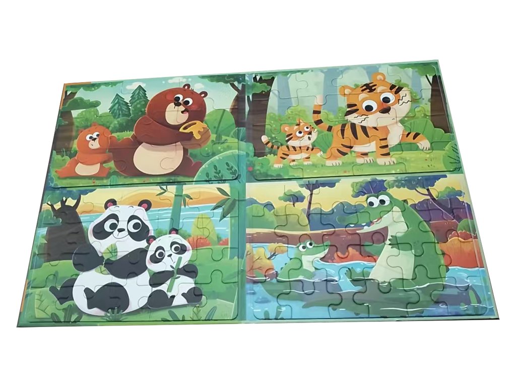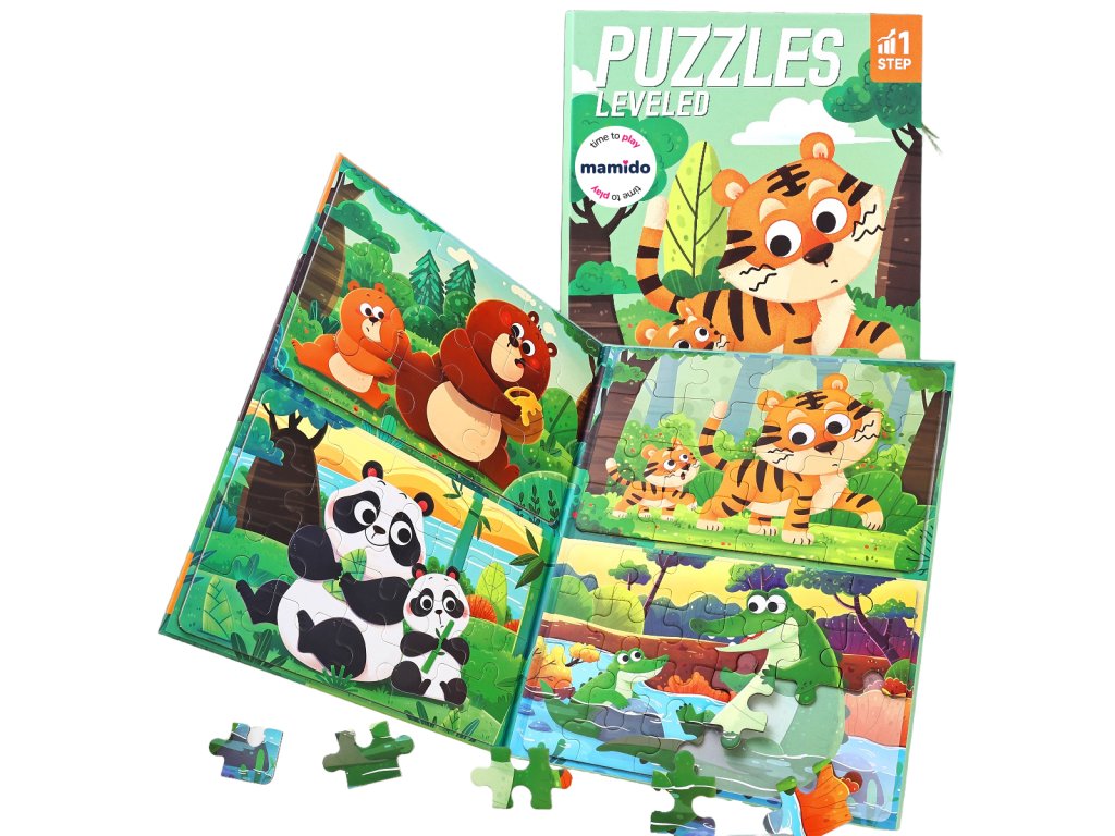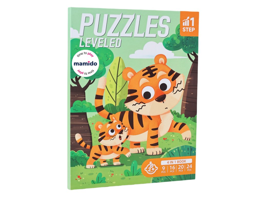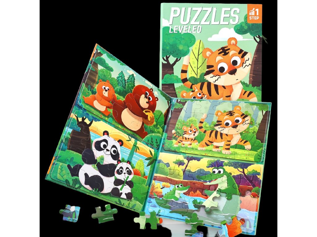 A puzzle világának felfedezése egyszerűen kezdődik, és fokozatosan nagyobb kihívássá válik. Ez a színes, 4 az 1-ben állatos készlet négy nehézségi szinten kíséri a gyerekeket – 9-től 24 darabig. Minden kép aranyos motívumot kínál, amely támogatja a koncentrációt, a finommotorikát és a befejezett munka örömét.