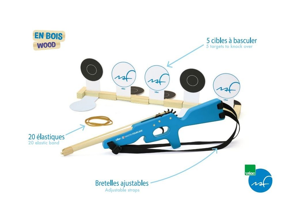 A játék fából készült, és állítható textil pántokkal rendelkezik. A kispuska készlete kék, a cső alatt francia zászló és a projekt készítőinek neve – Martin Fourcade, Vilac – kapott helyet. A csomagban öt összecsukható célpontot és húsz gumiszalagot talál. Állítsa be a pántokat fia, lánya vagy saját maga számára. Helyezze a célokat a kívánt távolságra, és helyezze őket a megfelelő pozícióba. Mutasd meg a gyerekeknek, hogyan kell helyesen és biztonságosan feszíteni a gumiszalagot a fából készült kis kaliberen. Most már csak célozni kell és meghúzni a ravaszt! Oké, hány próbálkozással tudod eltalálni mind az öt célpontot?