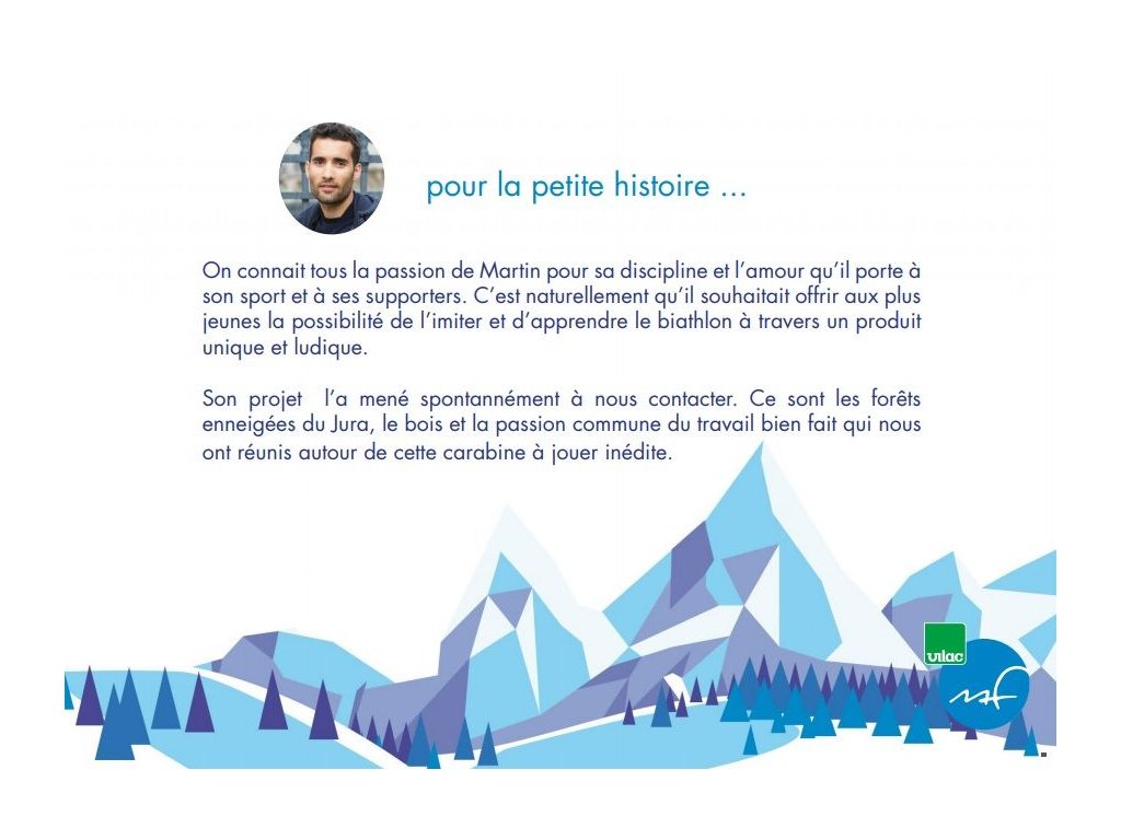 Martin Fourcade Franciaországban született és nőtt fel, talán ezért döntött úgy, hogy felkeresi a francia Vilac céget, amely játékok tervezésével és gyártásával foglalkozik. A hóval borított Jura-hegységben közösen találtak ki egy projektet, amely később sok gyereket és szülőt izgatott. Megcsinálták Martin biatlon kisfuratát. Mint a Vilac cég minden játéka, ez a kis ütés is a környezetet szem előtt tartva készült.