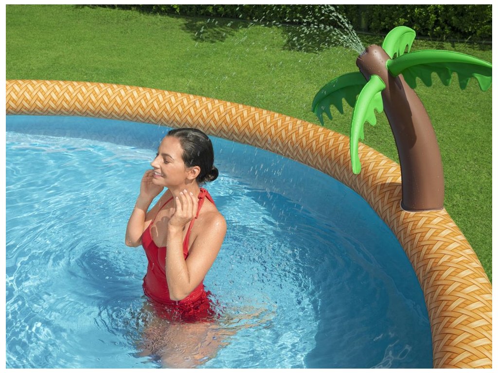 A medence Tritech anyagból készült, mely a polisztirol hálót és a két erős PVC réteget ötvözi. Csak helyezze a medencét vízszintes felületre, fújja fel a peremet, és töltse fel vízzel. A mellékelt szivattyú és szűrő biztosítja a víz tisztaságát. A felső gyűrűn egy felfújható pálmafa is található, amely a kerti tömlőhöz csatlakoztatva vizet permetez.