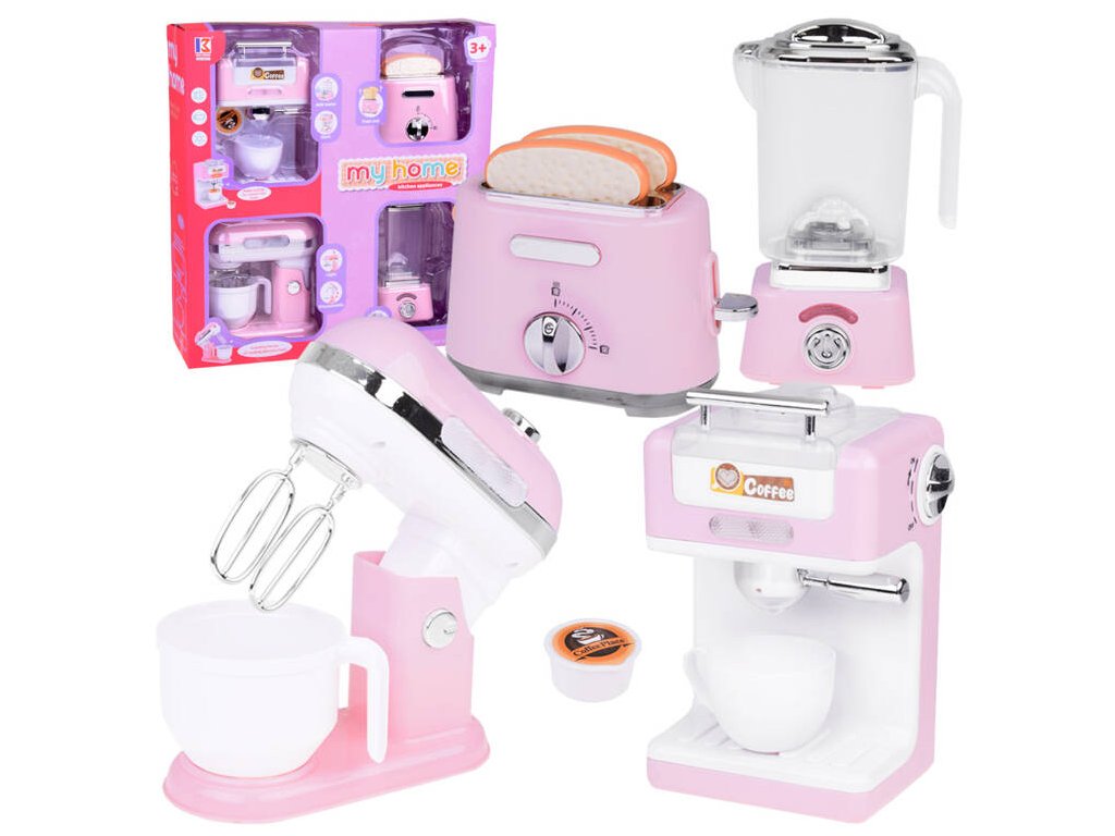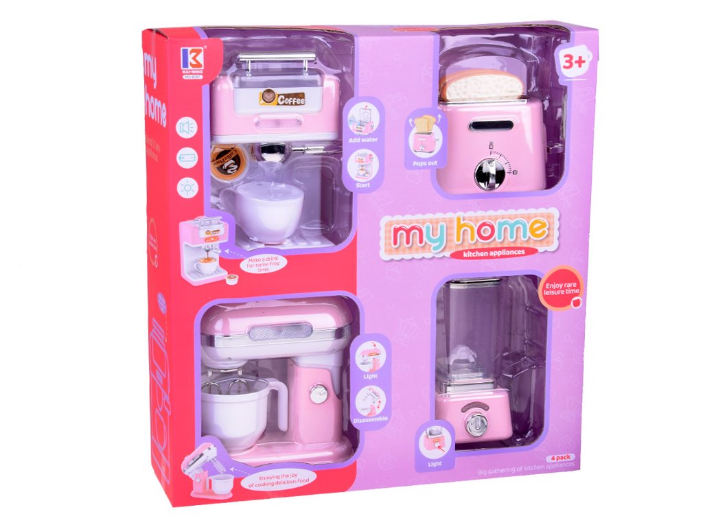Fantastická sada malých domácích spotřebičů se bude hodit v každé kuchyňce na hraní. Jednotlivé prvky jsou vyrobeny z kvalitního plastu s důrazem na detail, takže dokonale imitují skutečné spotřebiče. Světle růžové barevné provedení s bílými a chromovanými prvky působí úhledně a elegantně. Spotřebiče byly navíc vybaveny zvukovými a světelnými funkcemi, díky nimž jsou pro dítě ještě atraktivnější.