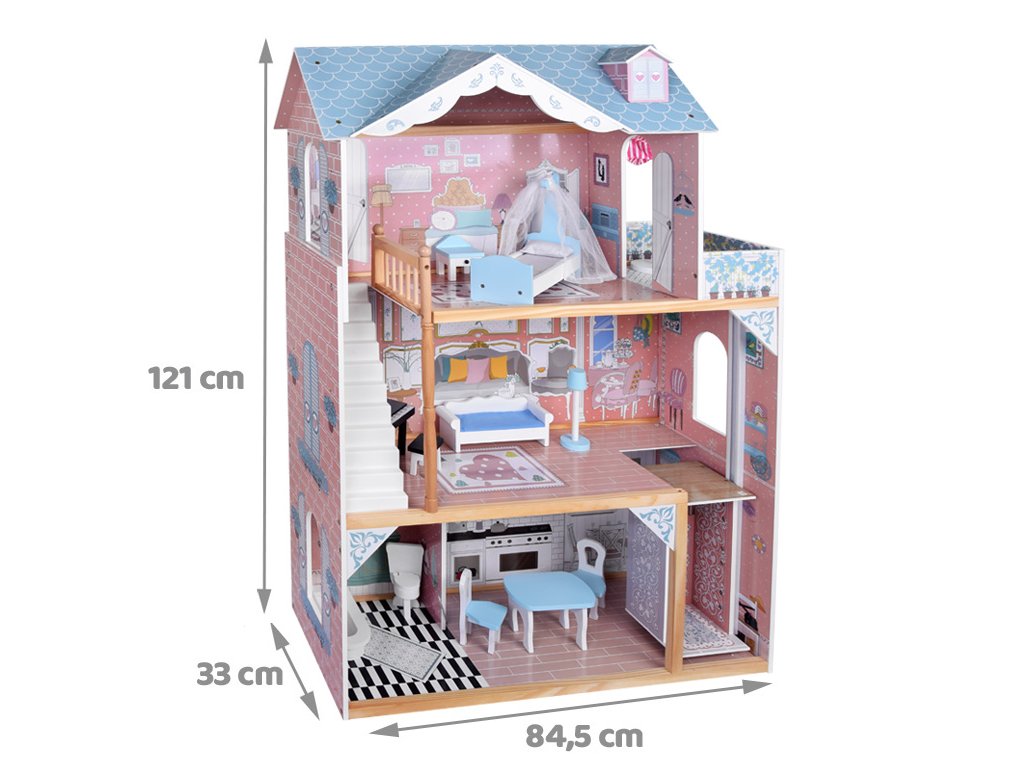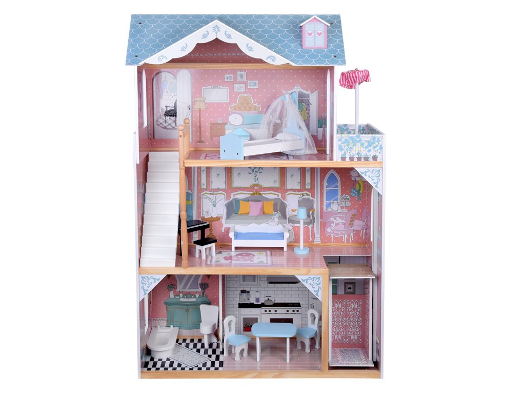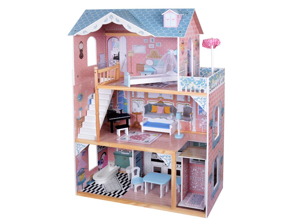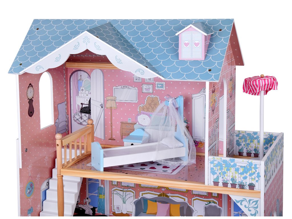 Mimořádně velký dřevěný domeček v tlumených pastelových barvách je hračkou snů pro každou holčičku. Díky své robustní konstrukci a elegantnímu designu poskytne tento domeček dlouhá léta kreativní hry.