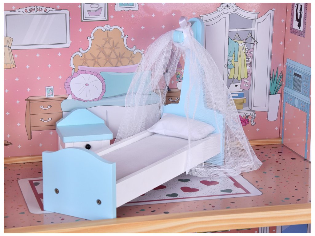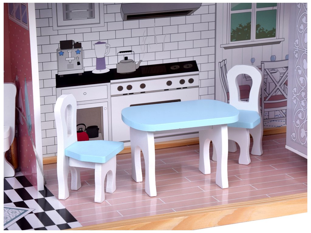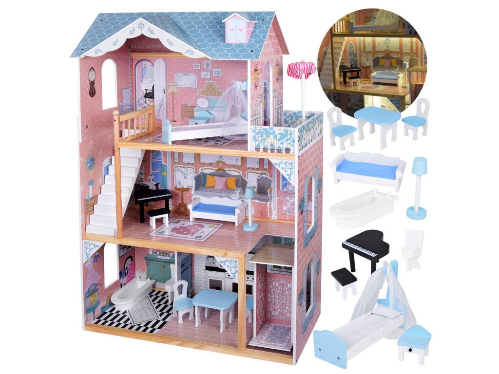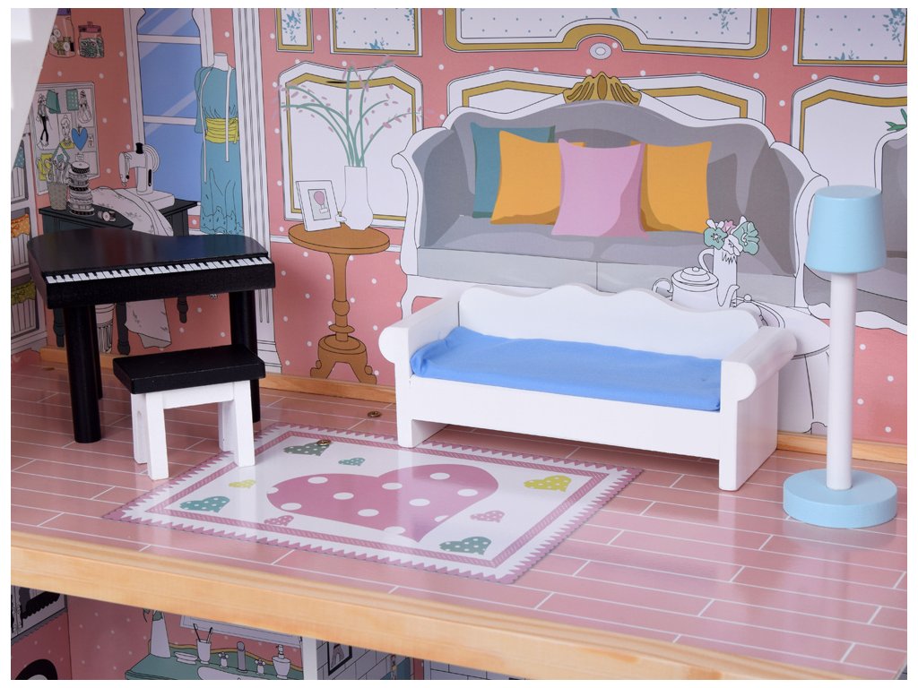 Mimořádně velký dřevěný domeček v tlumených pastelových barvách je hračkou snů pro každou holčičku. Díky své robustní konstrukci a elegantnímu designu poskytne tento domeček dlouhá léta kreativní hry.