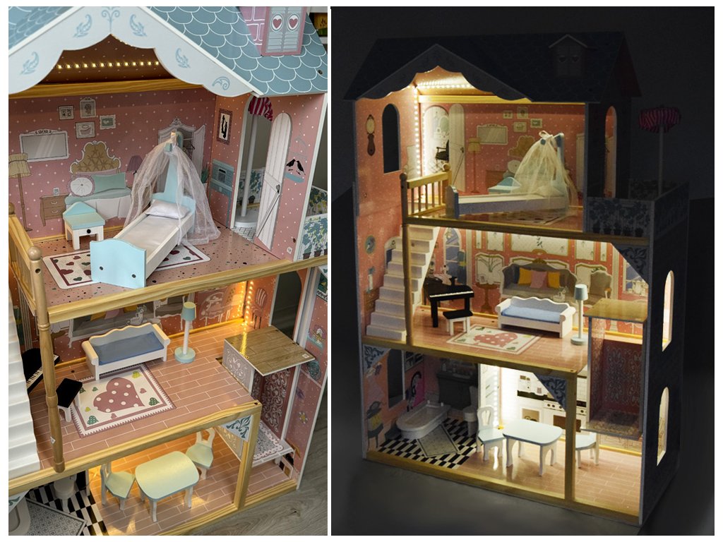 - Domeček je vybaven LED osvětlením, takže si s ním lze hrát i po setmění, což dodává celé stavbě pohádkový nádech. Pohyblivý výtah je dalším prvkem, který jistě zpestří hru.