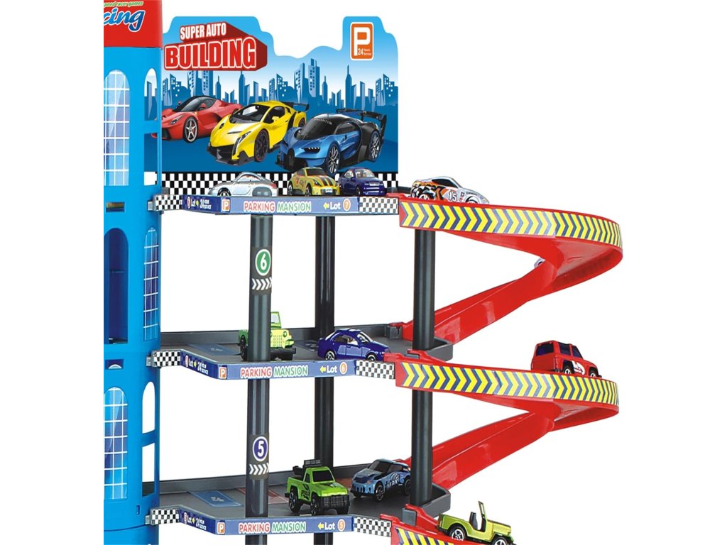 Nagy többszintes parkoló komplex, amely az autók, rámpák, lejtők és szórakoztató játékszekciók világát hozza el a gyerekeknek. Ez a többemeletes parkolóhely többszintes parkolást, egy magas központi tornyot és hosszú, spirális lejtőket kínál, amelyek lehetővé teszik a gyerekek számára, hogy az autókat fentről lefelé engedjék. Kisautók és kiegészítők is tartoznak hozzá a valósághű játékhoz.