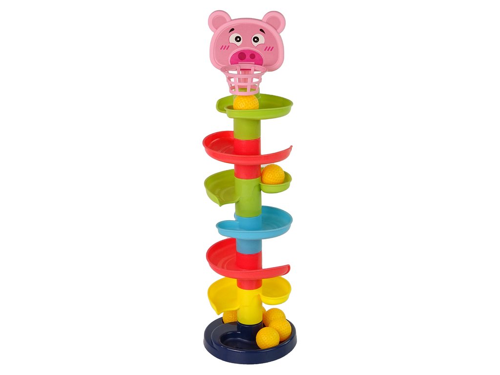 A csúszda 6 színes szintből áll, amelyeket a gyermek által elhelyezett labdának kell legyőznie. A felső részben egy kis malacka kosárral. A játék során a gyerkőc megpróbálja eltalálni a kosarat, és közben gyakorolja a koordinációt, a pontosságot és a kézügyességet.