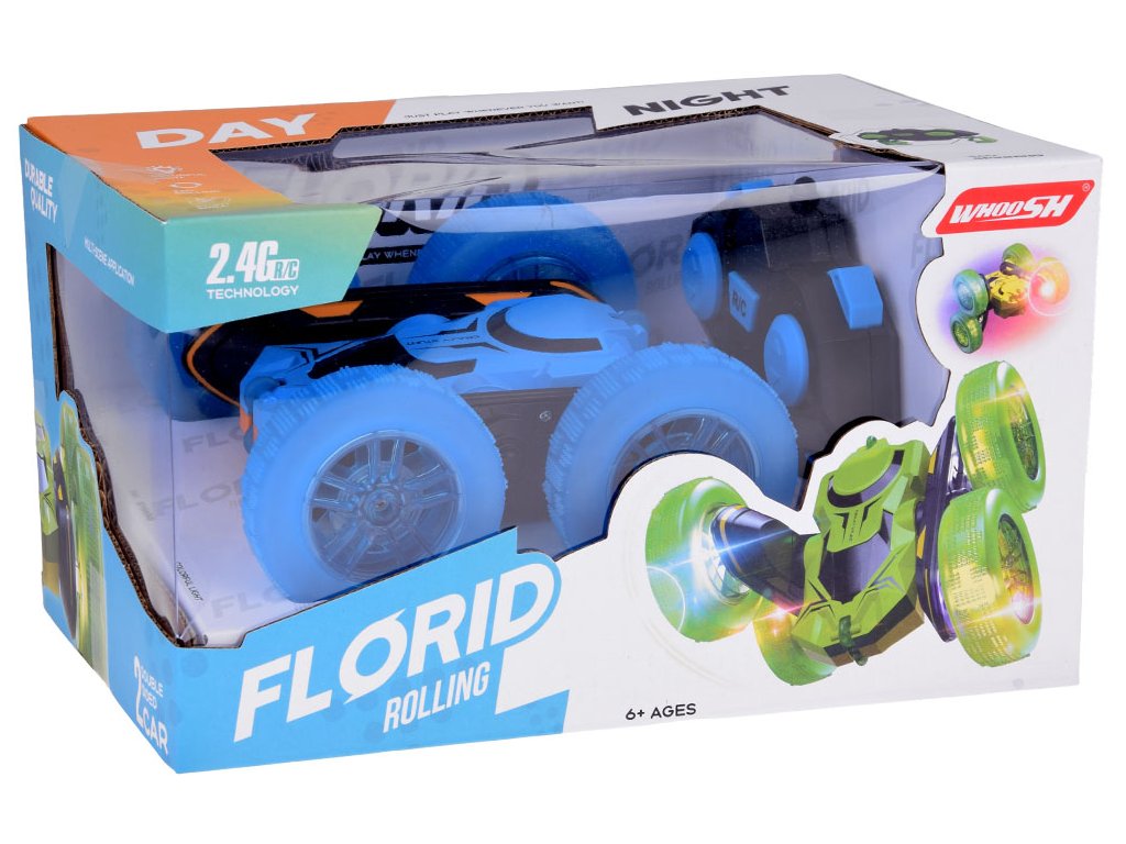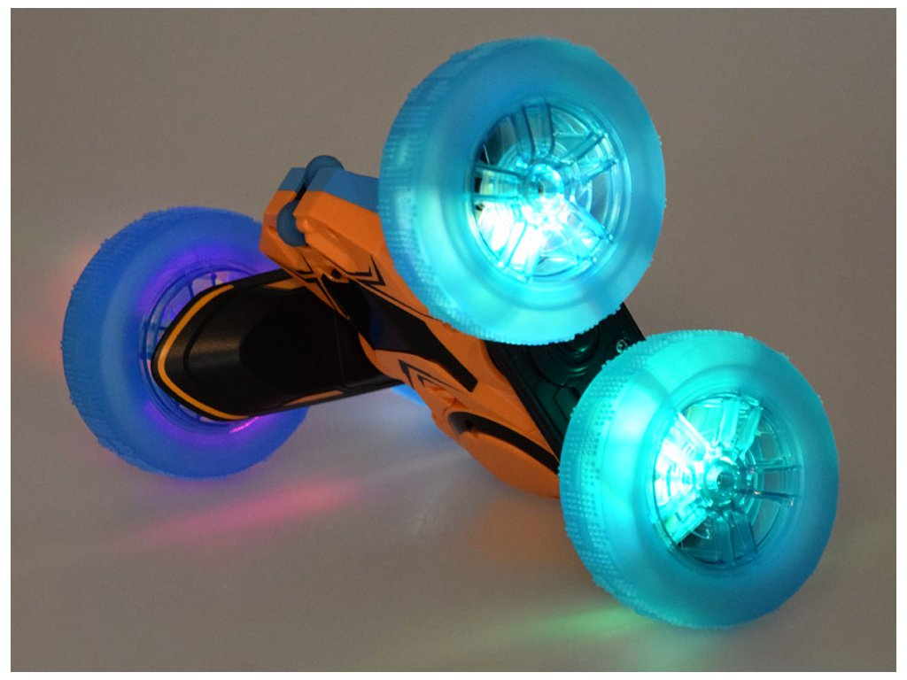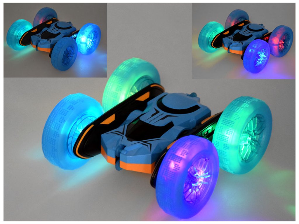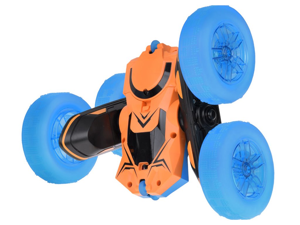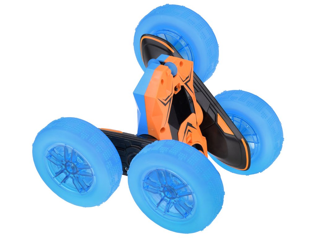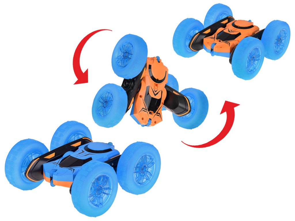 A távirányítós autó kétoldalas, ideális jármű az autózás és az őrült mutatványok kis rajongóinak. Innovatív kialakítása lehetővé teszi a teljes 360°-os elforgatást, ami azt jelenti, hogy az autó a másik oldalra történő átbillenés után tovább halad. A nagyméretű, jellegzetes mintázatú gumikerekeknek köszönhetően a jármű jól bírja az egyenetlen terepet is. A csapágyas kerekek lehetővé teszik a jármű számára, hogy lenyűgöző manővereket és akrobatikát hajtson végre, így egy nagyon izgalmas játék. A jármű izzó kerekei csodálatos ábrázolást hoznak létre alkonyatkor vagy sötét szobában.