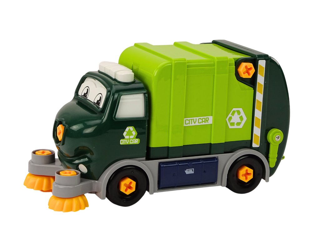 A szemeteskocsi élénkzöld színű, ami felkelti a figyelmet és játékra ösztönöz. Vezetés közben a jármű előtti sárga kefék forogni kezdenek, interaktivitást és valósághűséget kölcsönözve a játéknak. A gyerekek el tudják képzelni, hogy valóban az utcákat takarítják, ami további izgalmat ad a játéknak.