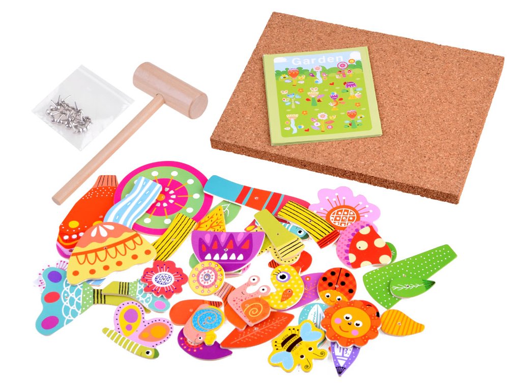 Kreativní sada ze série Přibíjení je hračka pro každého, kdo má rád manuální úkoly a ruční práce. Přibíjení pro děti je skvělá hračka, která nejenže přináší mnoho radosti, ale především učí děti trpělivosti (při přibíjení jednotlivých prvků na korkovou tabuli) a správnému zobrazení toho, co je nakresleno na kartách. Díky přibíjení dítě procvičuje jemnou motoriku rukou, koncentraci a učí se kreativnímu myšlení.