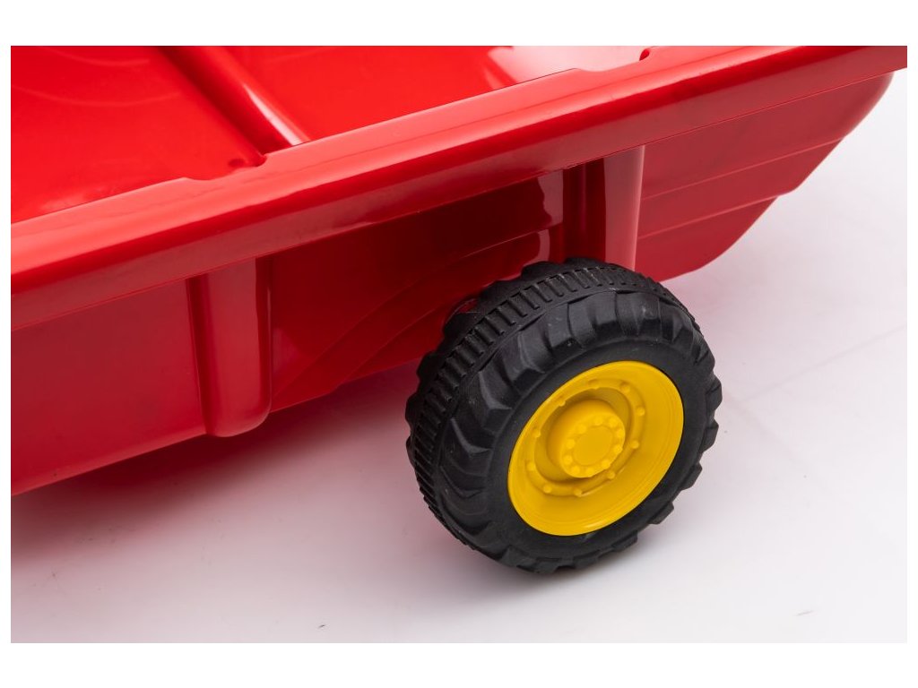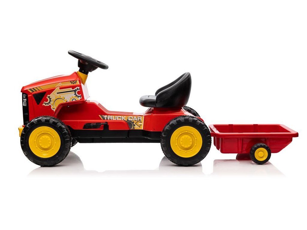 A traktor előnye az utánfutó, melybe a gyerek elhelyezheti kedvenc játékait és kiviheti őket egy körre.