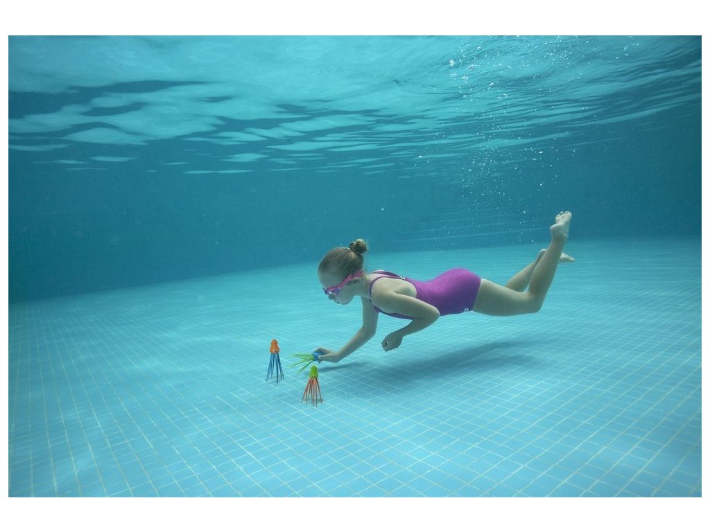 Sada je určena pro děti od 3 let a je ideální pro úvodní výuku plavání, tvarování pohybu dítěte a seznámení se s vodou. Potápěčské chobotnice jsou vyrobeny z bezpečných materiálů a neobsahuje latex. Mají zátěž, která znamená, že vždy spadnou na dno, zatímco zůstávají vzpřímeně na chapadlech.