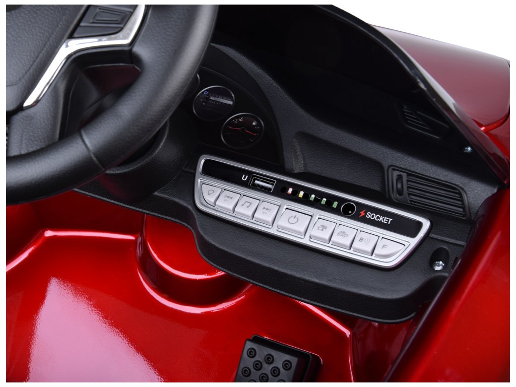 Multimediální panel nabízí bohatou výbavu: FM rádio, Bluetooth, vstup MP3, USB a přednahrané písničky. Dítě může měnit hlasitost, přepínat skladby nebo ovládat světla (stálé, blikající, vypnuté). Ve volantu jsou integrovaná tlačítka pro klakson a zvuky motoru. Autíčko se spouští tlačítkem ON/OFF a po zapnutí zazní realistický zvuk startování motoru.