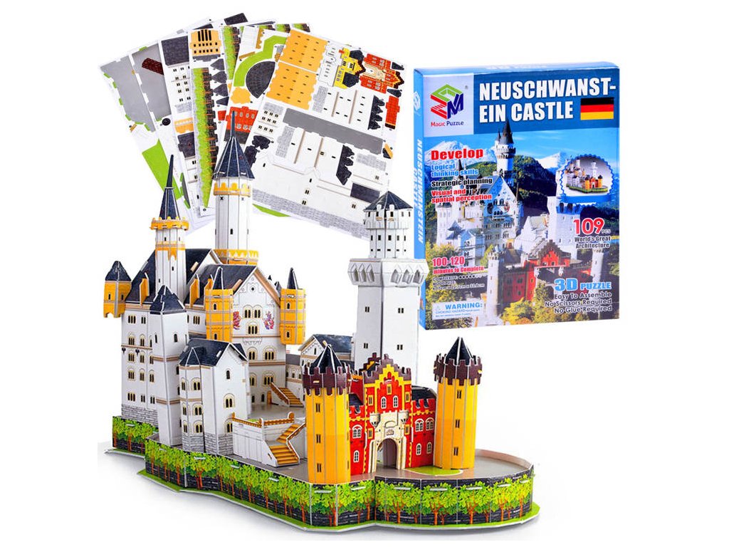 Prostorová 109-dílná skládačka představující hrad Neuschwanstein jistě okouzlí každého malého milovníka 3D skládaček nebo modelářství. Hrad Neuschwanstein byl postaven Ludvíkem II. Bavorským jako útulek a pocta skladateli Richardu Wagnerovi za jeho inspirativní hudbu. I když je veřejné focení interiéru zakázáno, je to nejčastěji fotografovaná stavba v Německu a jedno z nejpopulárnějších turistických míst v zemi. Dnes je Neuschwanstein jedním z nejnavštěvovanějších paláců a hradů v Evropě. Je také nominován jako jeden ze Sedmi nových divů světa.