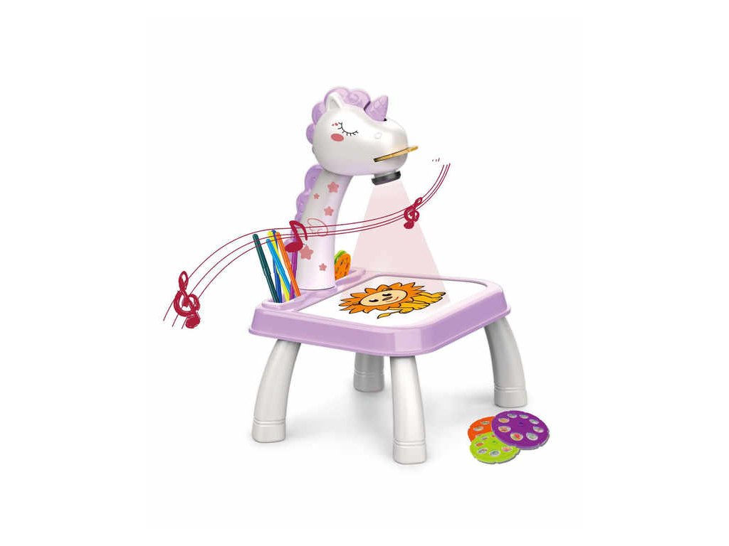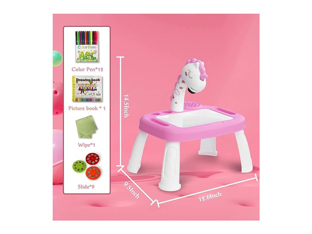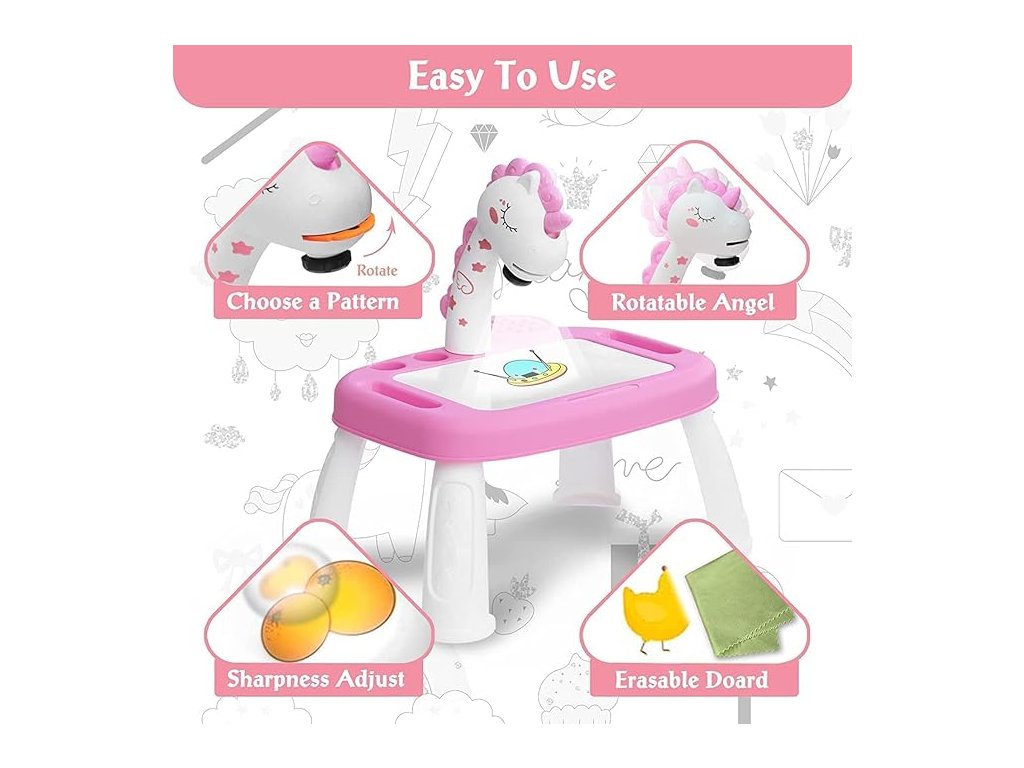 Kreatív ajándékok fejlesztése - Gyerekasztal okosprojektorral. Ez a játék nem csak támogatja és ösztönzi a gyerekeket, hogy rajzoljanak és festessenek játék közben, hanem egy olyan oktatási eszköz is, amely fejlesztheti gyakorlati készségeiket. Az aranyos kialakításnak köszönhetően ez a projektor ideális ajándék gyerekeknek.