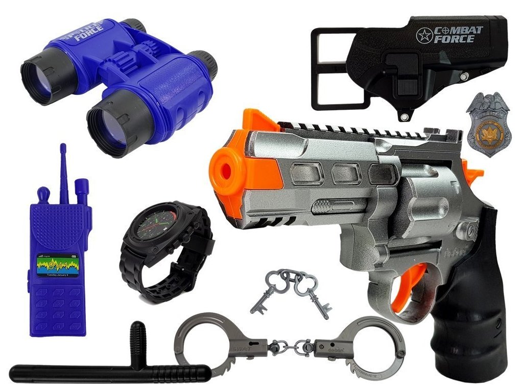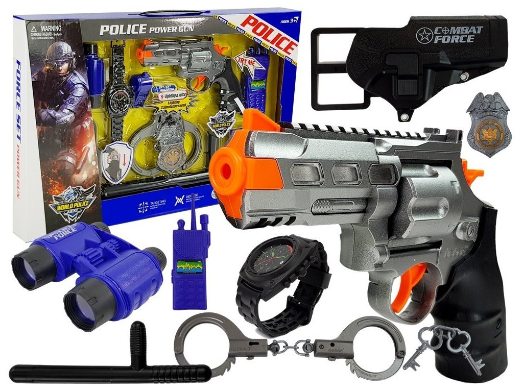 A fiatal rendőrnek szánt készlet négy elemből áll. Mindegyik kiváló minőségű anyagból készült, ami garancia arra, hogy sokáig szolgálja a gyermeket. A pisztoly ezüst-fekete színben készül. A puska lövés hangját adja ki, csak nyomja meg a ravaszt és töltéskor. Egy tolvaj sem menekül! A gyerek fantáziája biztosan fejlődni fog. Egy másik előny a fényhatás a fényképezés során. A készlet távcsövet, bilincset és pálcikát is tartalmaz. A kiegészítők a nagyszámú kiegészítő miatt két gyerek játékát is lehetővé teszik.