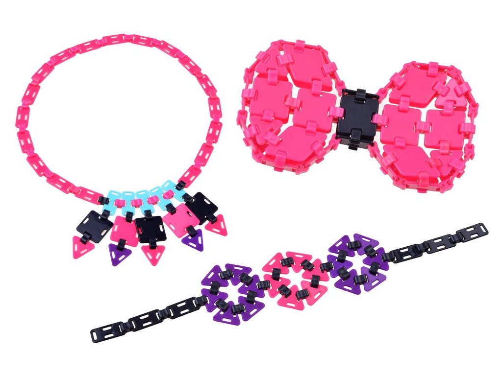 A készlet különböző formájú műanyag elemeket tartalmaz: négyzetek, téglalapok, háromszögek, melyeket az utasítások vagy saját koncepció szerint kell összekötőkkel összekötni, hogy létrejöjjön pl.: medál, karkötő, hajdísz vagy hátizsák, bármi. kitalálsz.