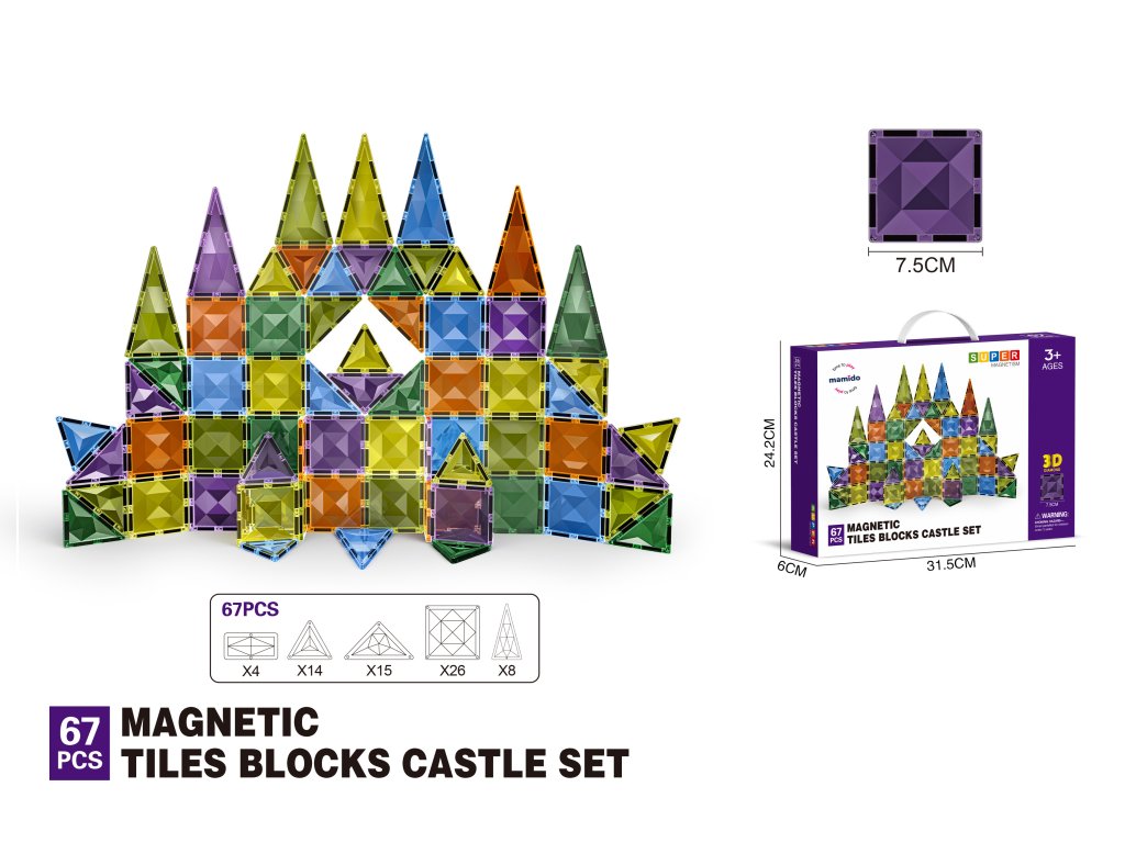 A készlet 67 mágneses elemet tartalmaz 7,5 cm-es méretben, amelyek az erős mágneseknek köszönhetően könnyen összeilleszthetők, lehetővé téve egyszerű és nagyobb 3D konstrukciók építését. Különböző formák és színek támogatják a képzelet és a finommotorika fejlődését. A játékkészlet kompatibilis a legtöbb elterjedt mágneses panellel, így könnyen bővíthető.