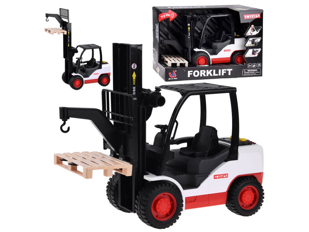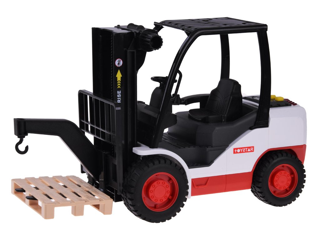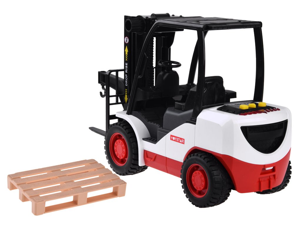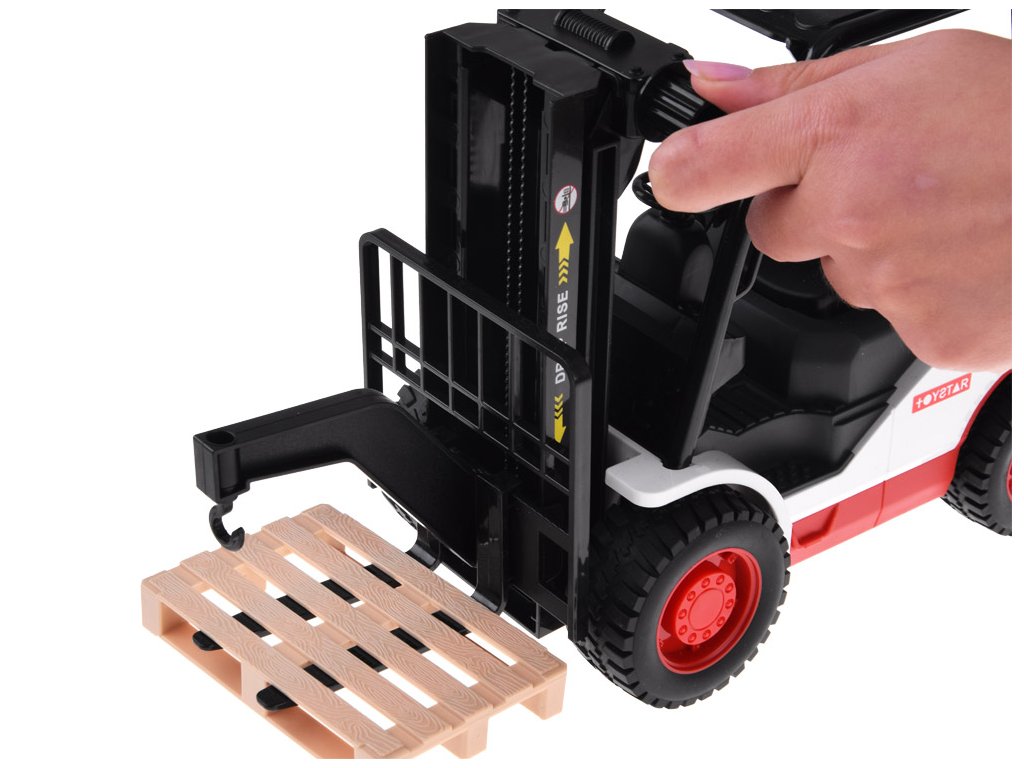 Velký vysokozdvižný vozík s paletou je ideální volbou pro každého malého fandu motorismu a stavebnictví. Toto vozidlo bylo pečlivě zreplikováno, co mu dodává velmi realistický vzhled. Vozidlo má pohon třením, díky čemuž se po nastartování kol umístěných na zemi pohybuje. Vysokozdvižný vozík je zhotoven z plastu, má pohyblivé prvky, světelné a zvukové efekty a kola jsou z gumy, co umožní snadné pohybování vozidla. Další výhodou je nastavitelný zdvihák, který můžeme spustit pomocí knoflíku umístěného v horní části zdviháku. Toto vozidlo jistě bude skvělým doplněním sbírky stavebních strojů pro každého milovníka těchto vozidel a zvládne jakýkoliv náklad.