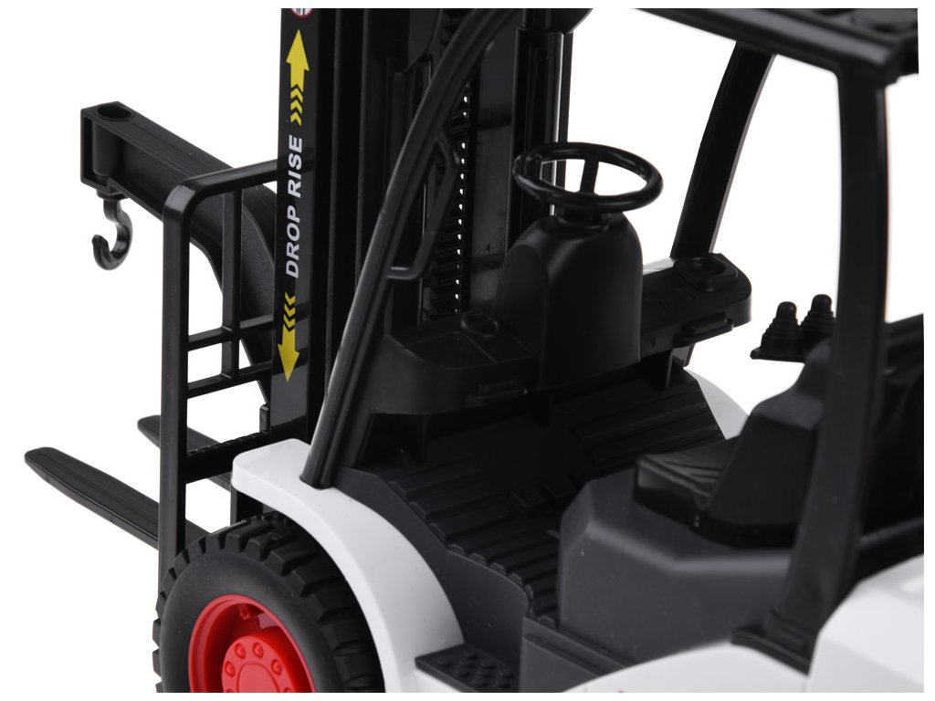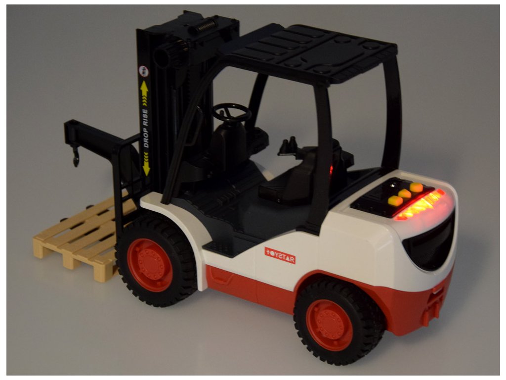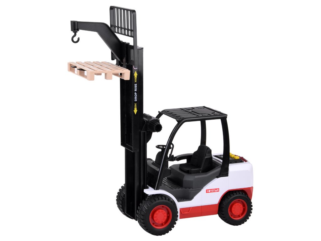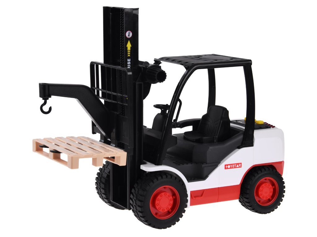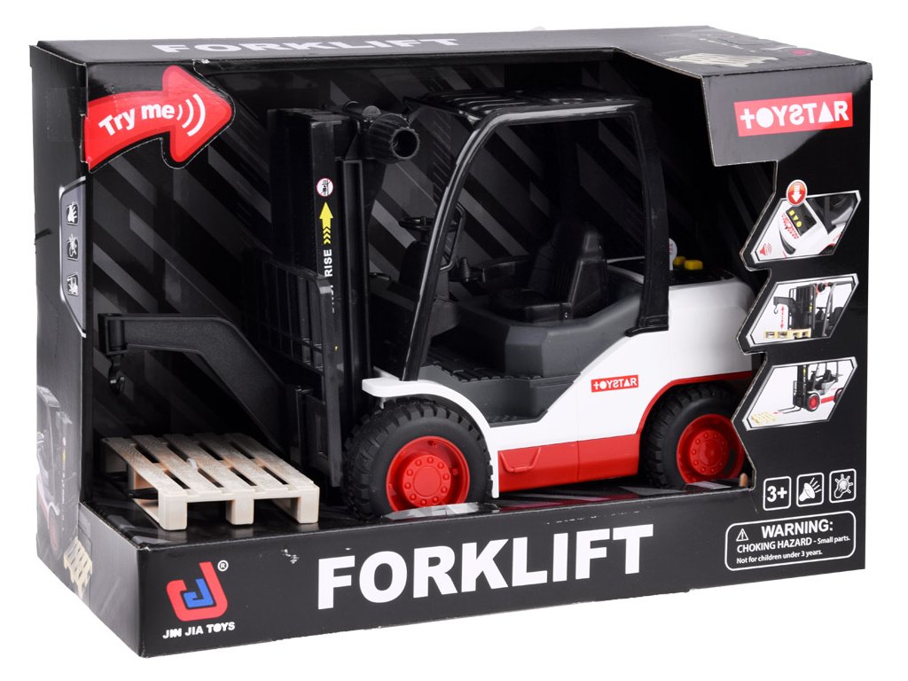 Velký vysokozdvižný vozík s paletou je ideální volbou pro každého malého fandu motorismu a stavebnictví. Toto vozidlo bylo pečlivě zreplikováno, co mu dodává velmi realistický vzhled. Vozidlo má pohon třením, díky čemuž se po nastartování kol umístěných na zemi pohybuje. Vysokozdvižný vozík je zhotoven z plastu, má pohyblivé prvky, světelné a zvukové efekty a kola jsou z gumy, co umožní snadné pohybování vozidla. Další výhodou je nastavitelný zdvihák, který můžeme spustit pomocí knoflíku umístěného v horní části zdviháku. Toto vozidlo jistě bude skvělým doplněním sbírky stavebních strojů pro každého milovníka těchto vozidel a zvládne jakýkoliv náklad.