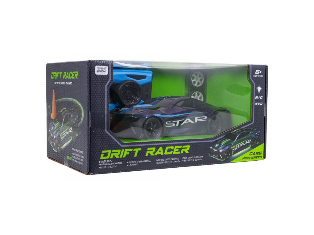 Csillag távirányítású jármű hatéves kortól gyermekeknek. A jármű a legmagasabb minőségű, sérülésálló anyagokból készült. Neki van gumikerekek jó tapadással a cserélhető kerekekkel a drifteléshez. Egy pisztoly alakú távirányítóval vezérelhető. A jármű elöl és alul is világítással rendelkezik. 0 és 12 km/h közötti sebességnél világít zöld, 0 és 16 km/h között kék és 0 és 20 km/h között piros. A járművet 7,4 V-os akkumulátor táplálja (a csomag része), a távirányítót pedig 2 x AA 1,5 V-os elemek (nem tartozék).