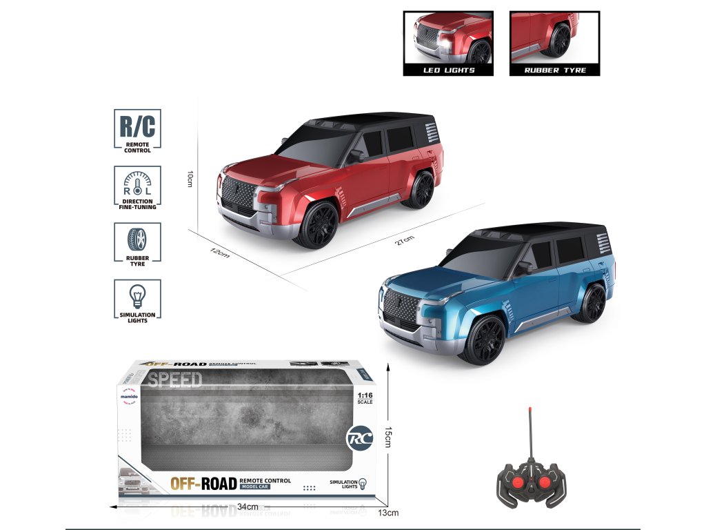 Stílusos, 1:16 méretarányú távirányítós autó minden kis versenyzőt boldoggá tesz. A modell terepjáróautó-szerű megjelenésű, LED lámpákkal, tartós gumiabroncsokkal van felszerelve, és könnyen vezérelhető a távirányítóval.
