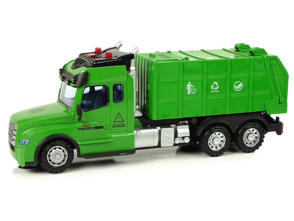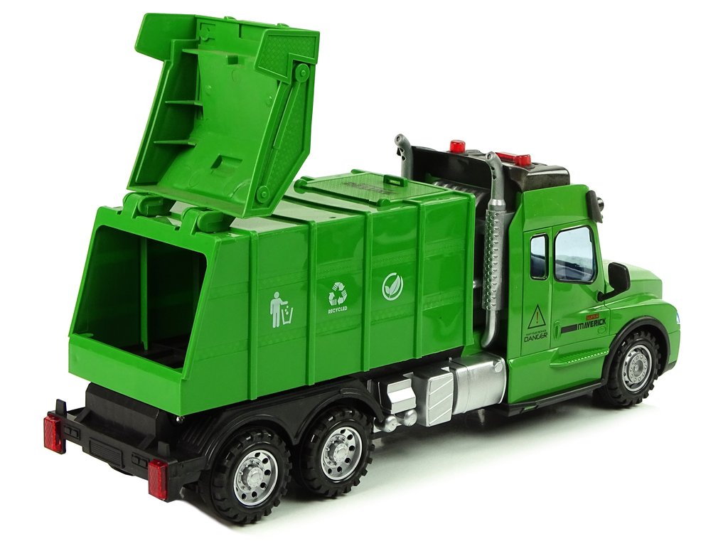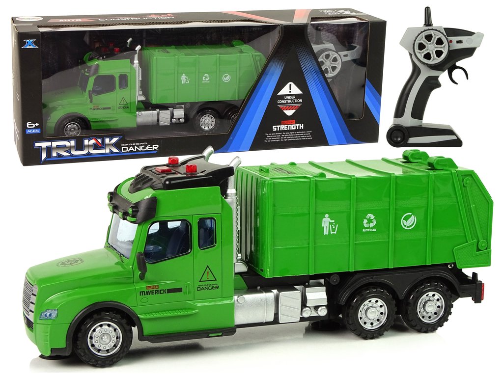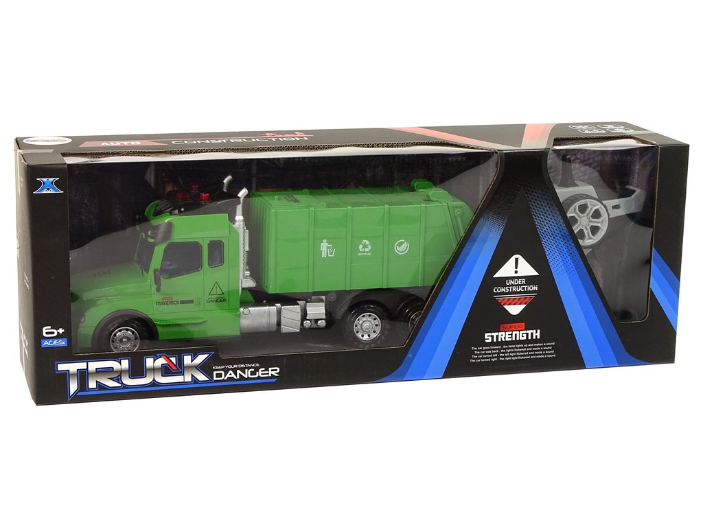 A távirányítós dump a modell valósághű mása. A zöldhulladék edényt fehér részletek és jellegzetes matricák díszítik. A távirányító frekvenciája 2,4 Ghz. Az R/C vezérlése nagyon egyszerű, és a vezérlő kényelmesen elfér a zsebében. A távirányítóval a teherautó-vezető szabályozhatja a haladási irányt előre/hátra és jobbra/balra.