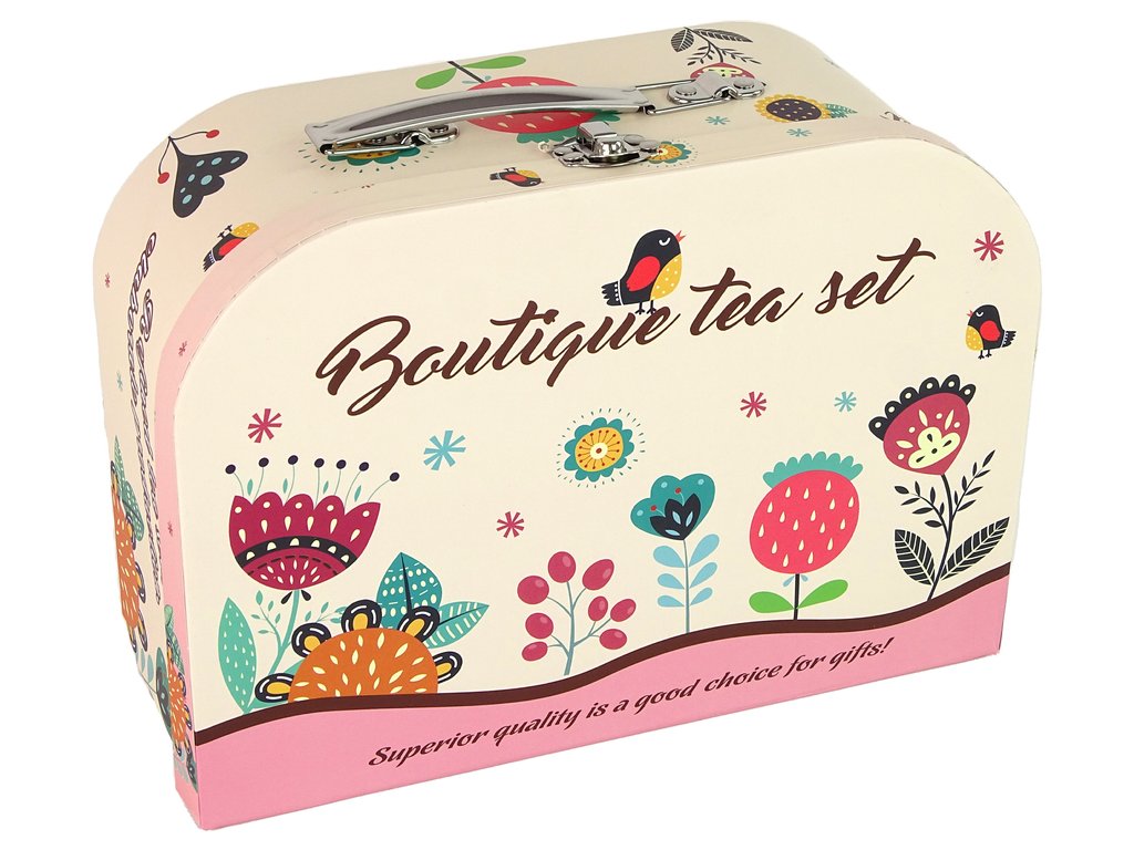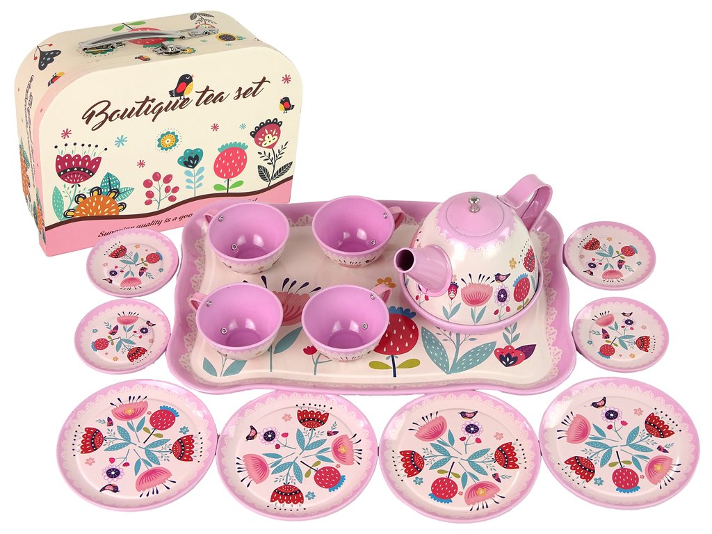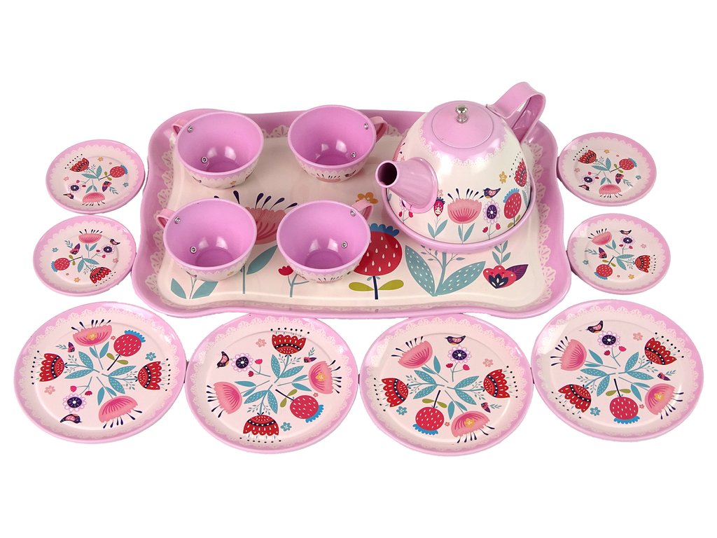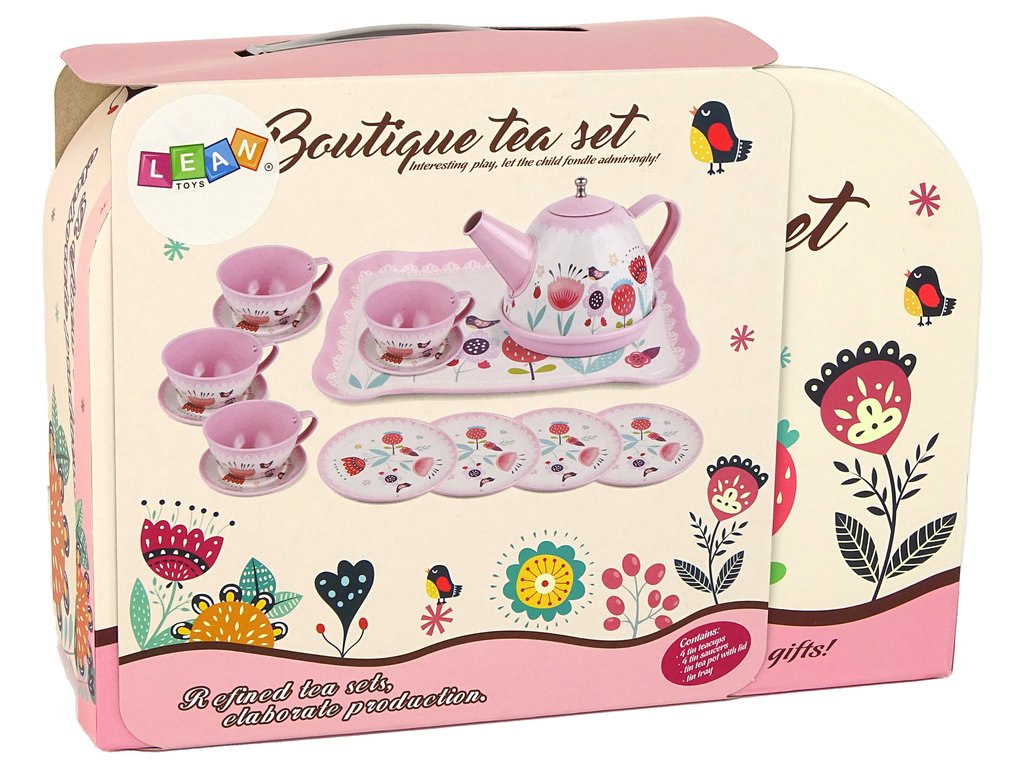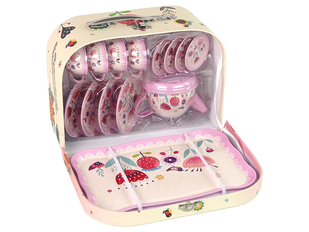 A tok belsejében egy kávé- és teakészlet található, amely kis és nagy tányérokból, teáskannából, csészékből és tálcából áll. A készlet minden eleme aranyos rózsaszín színű és érdekes mintákkal rendelkezik, amelyek felkeltik a figyelmet.