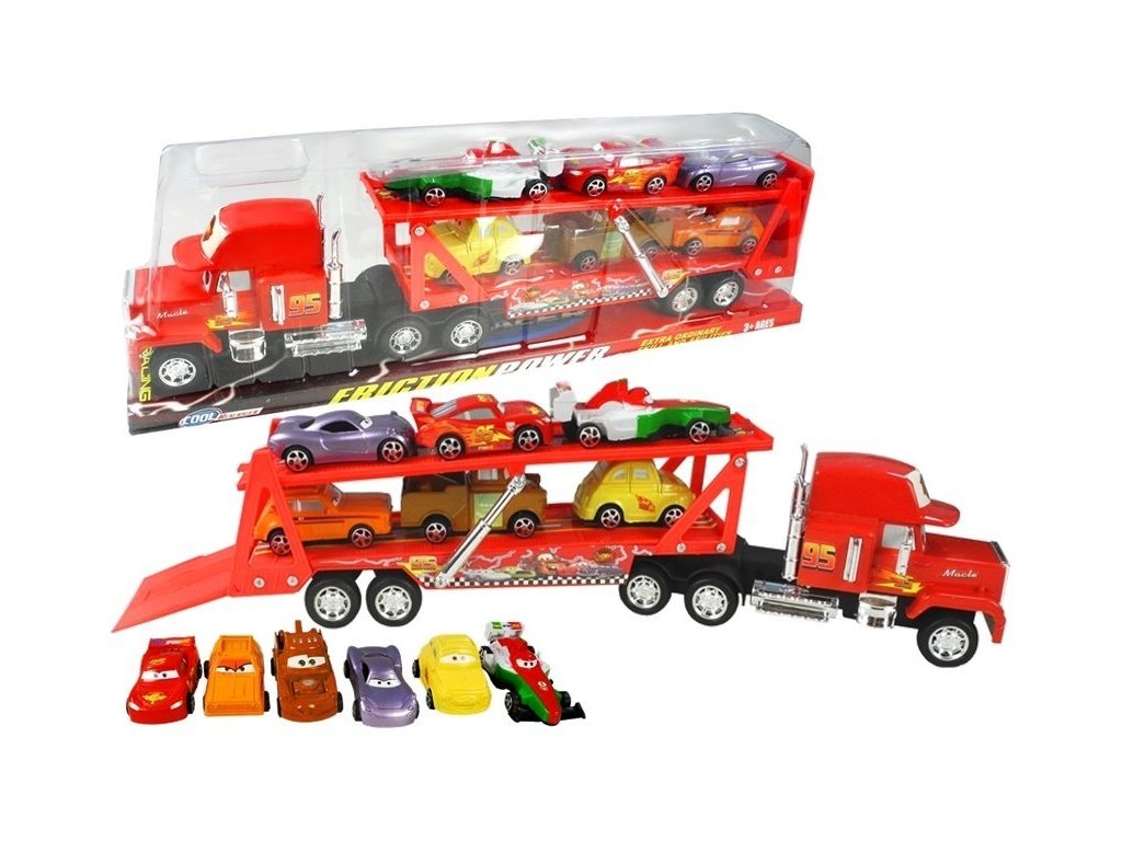 Ez a készlet autómodelleket tartalmaz a népszerű Cars című film híres szereplőivel. A vontató egy alsó és egy felső részből áll, amelyek leengedhetők, így két emeleten lehet autókat rakodni.