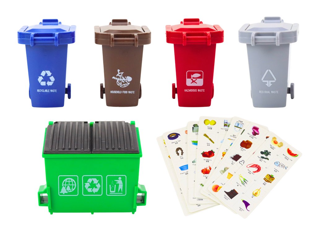 Többfunkciós zöld fém szemeteskocsi súrlódó meghajtással és színes kukákkal