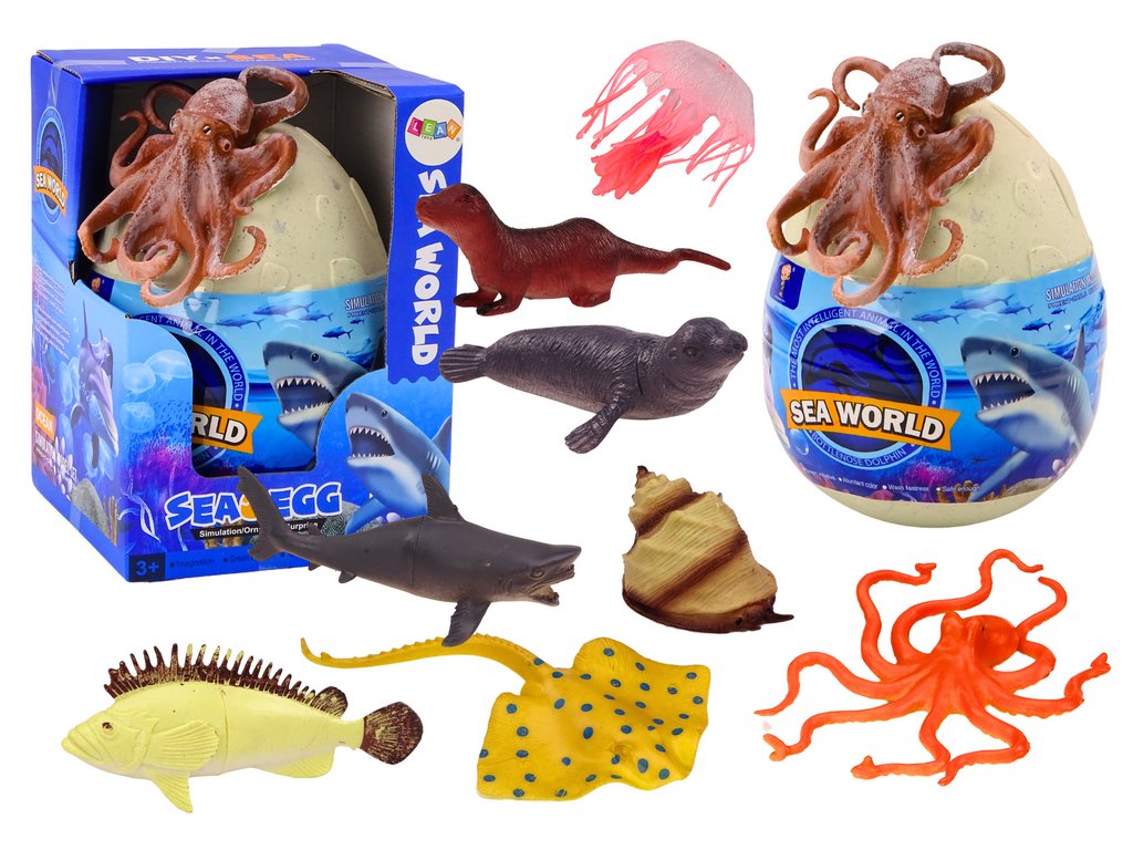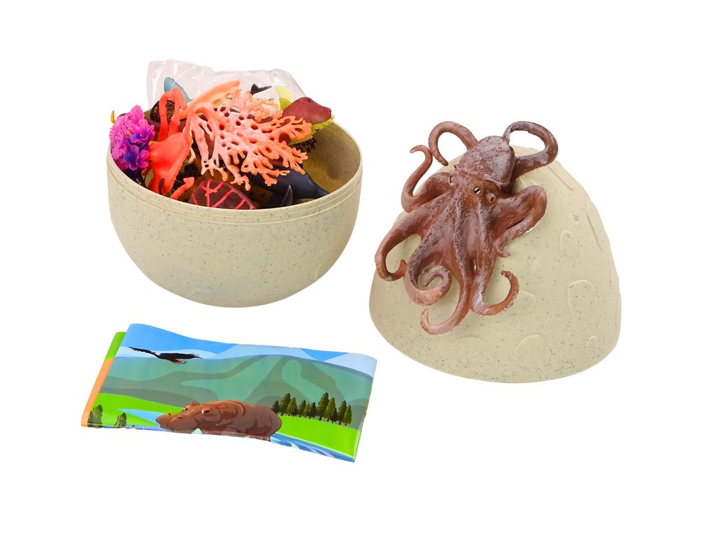 A tojás belsejében 20 tengeri állatfaj található, köztük fókák, delfinek, cápák és medúzák. Minden figura gondosan kidolgozott és részletes, lehetővé téve a gyerekek számára, hogy jobban megértsék a tengeri állatvilág sokszínűségét. Ezenkívül a készlet 6 vízi növényt tartalmaz, amelyek segítenek valósághű víz alatti jelenetek létrehozásában, és arra ösztönzik a gyerekeket, hogy saját tengeri ökoszisztémát alkossanak.